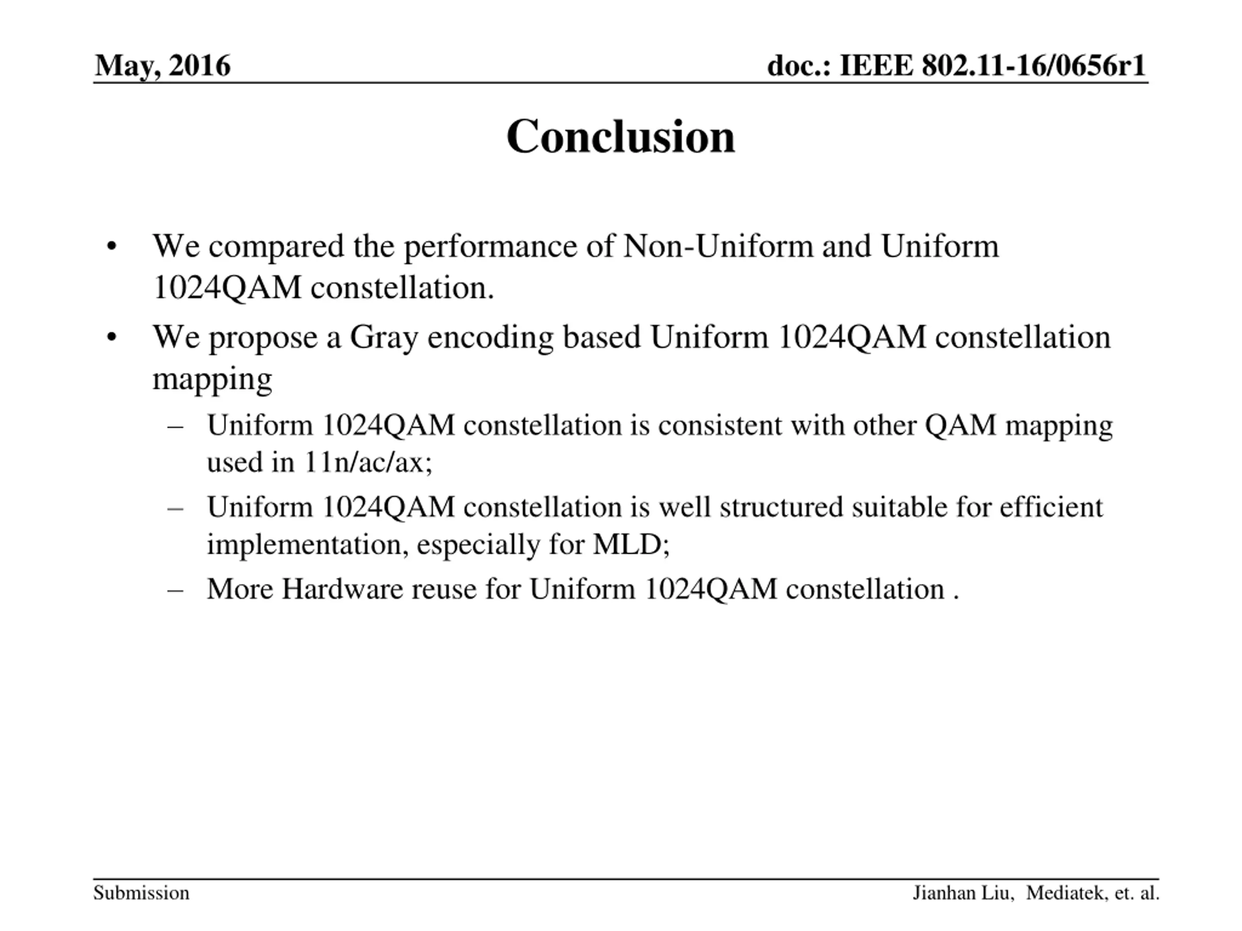 May, 2016 doc.: IEEE 802.11-16/0656r1 Conclusion We compared the performance of Non-Uniform and Uniform 1024QAM constellation. We propose a Gray encoding based Uniform 1024QAM constellation mapping Uniform 1024QAM constellation is consistent with other QAM mapping used in 11n/ac/ax; Uniform 1024QAM constellation is well structured suitable for efficient implementation, especially for MLD; More Hardware reuse for Uniform 1024QAM constellation . Submission Jianhan Liu, Mediatek, et. al.