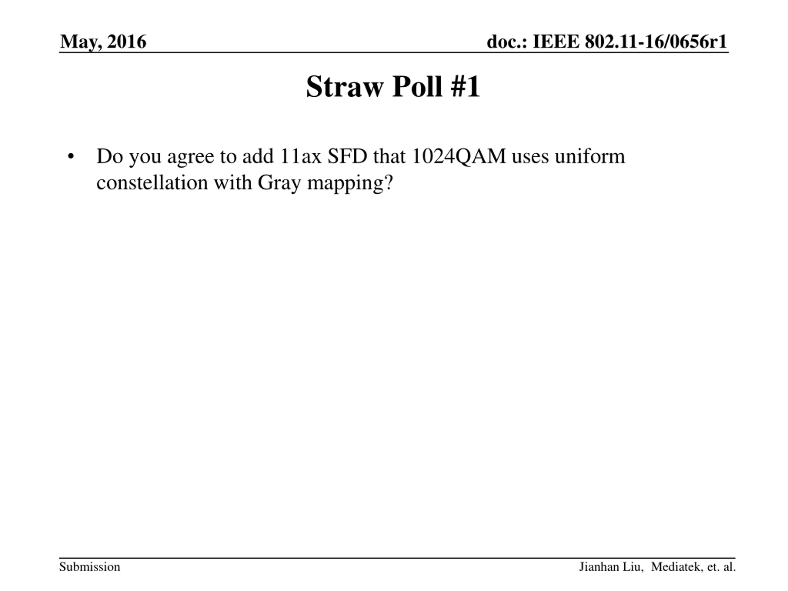 May, 2016 doc.: IEEE 802.11-16/0656r1 Straw Poll #1 Do you agree to add 11ax SFD that 1024QAM uses uniform constellation with Gray mapping? Submission Jianhan Liu, Mediatek, et. al.