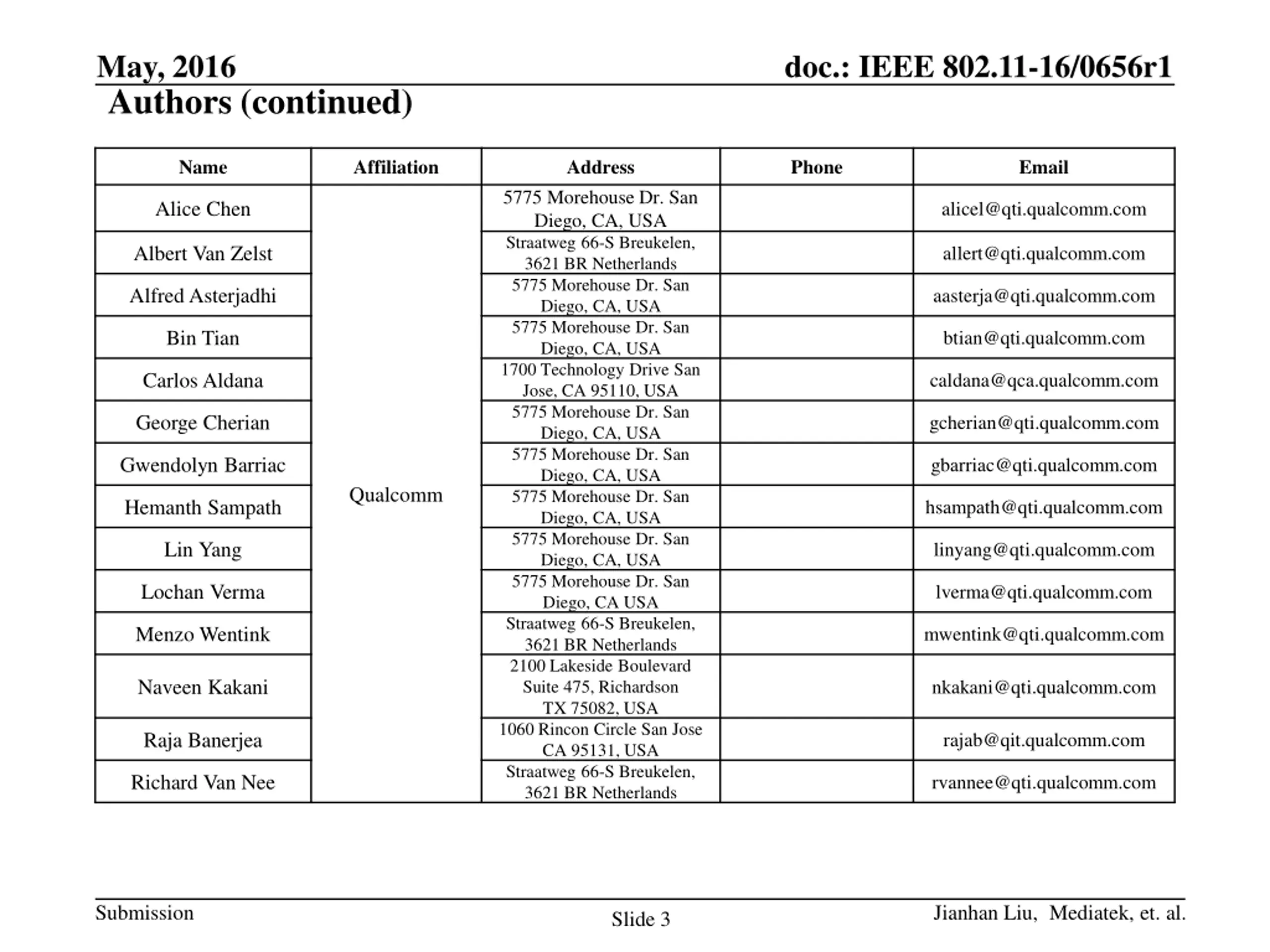 May, 2016 doc.: IEEE 802.11-16/0656r1 Authors (continued) Name Affiliation Address Phone Email 5775 Morehouse Dr. San Diego, CA, USA Straatweg 66-S Breukelen, 3621 BR Netherlands 5775 Morehouse Dr. San Diego, CA, USA 5775 Morehouse Dr. San Diego, CA, USA 1700 Technology Drive San Jose, CA 95110, USA 5775 Morehouse Dr. San Diego, CA, USA 5775 Morehouse Dr. San Diego, CA, USA 5775 Morehouse Dr. San Diego, CA, USA 5775 Morehouse Dr. San Diego, CA, USA 5775 Morehouse Dr. San Diego, CA USA Straatweg 66-S Breukelen, 3621 BR Netherlands 2100 Lakeside Boulevard Suite 475, Richardson TX 75082, USA 1060 Rincon Circle San Jose CA 95131, USA Straatweg 66-S Breukelen, 3621 BR Netherlands Alice Chen alicel@qti.qualcomm.com Albert Van Zelst allert@qti.qualcomm.com Alfred Asterjadhi aasterja@qti.qualcomm.com Bin Tian btian@qti.qualcomm.com Carlos Aldana caldana@qca.qualcomm.com George Cherian gcherian@qti.qualcomm.com Gwendolyn Barriac gbarriac@qti.qualcomm.com Qualcomm Hemanth Sampath hsampath@qti.qualcomm.com Lin Yang linyang@qti.qualcomm.com Lochan Verma lverma@qti.qualcomm.com Menzo Wentink mwentink@qti.qualcomm.com Naveen Kakani nkakani@qti.qualcomm.com Raja Banerjea rajab@qit.qualcomm.com Richard Van Nee rvannee@qti.qualcomm.com Submission Jianhan Liu, Mediatek, et. al. Slide 3