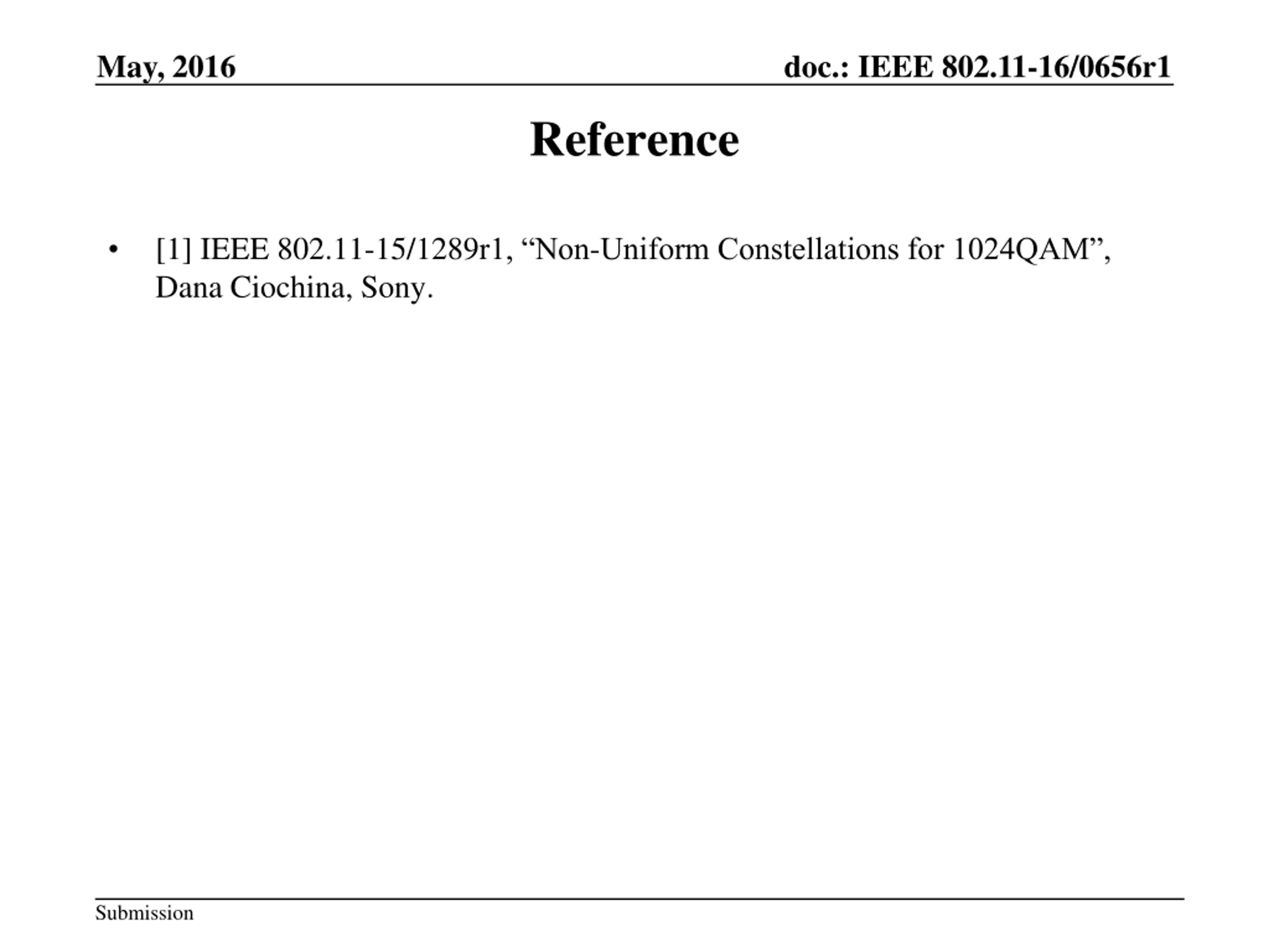 May, 2016 doc.: IEEE 802.11-16/0656r1 Reference [1] IEEE 802.11-15/1289r1, Non-Uniform Constellations for 1024QAM , Dana Ciochina, Sony. Submission