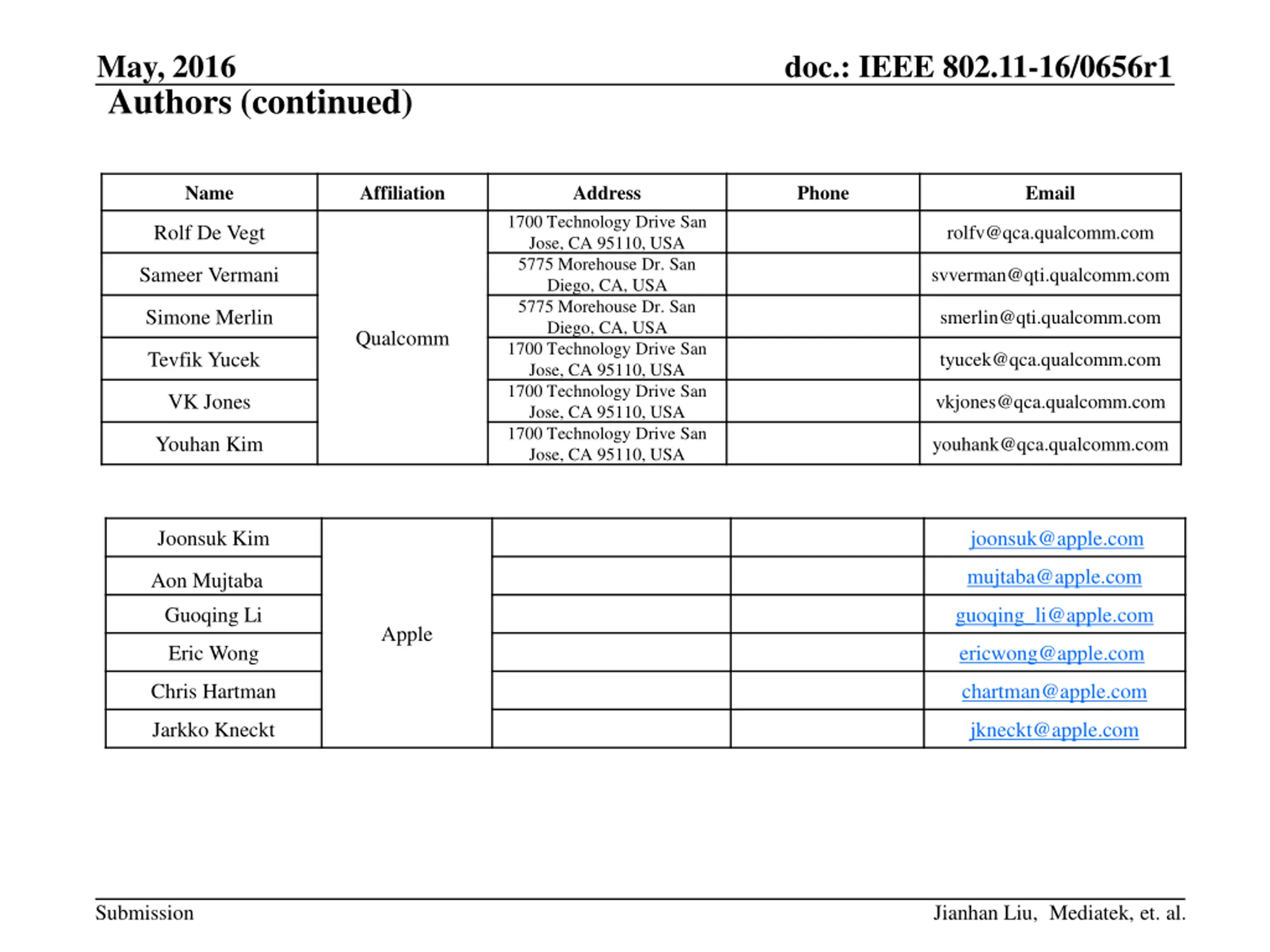 May, 2016 doc.: IEEE 802.11-16/0656r1 Authors (continued) Name Affiliation Address Phone Email 1700 Technology Drive San Jose, CA 95110, USA 5775 Morehouse Dr. San Diego, CA, USA 5775 Morehouse Dr. San Diego, CA, USA 1700 Technology Drive San Jose, CA 95110, USA 1700 Technology Drive San Jose, CA 95110, USA 1700 Technology Drive San Jose, CA 95110, USA Rolf De Vegt rolfv@qca.qualcomm.com Sameer Vermani svverman@qti.qualcomm.com Simone Merlin smerlin@qti.qualcomm.com Qualcomm Tevfik Yucek tyucek@qca.qualcomm.com VK Jones vkjones@qca.qualcomm.com Youhan Kim youhank@qca.qualcomm.com Joonsuk Kim joonsuk@apple.com mujtaba@apple.com Aon Mujtaba Guoqing Li guoqing_li@apple.com Apple Eric Wong ericwong@apple.com Chris Hartman chartman@apple.com Jarkko Kneckt jkneckt@apple.com Submission Jianhan Liu, Mediatek, et. al.