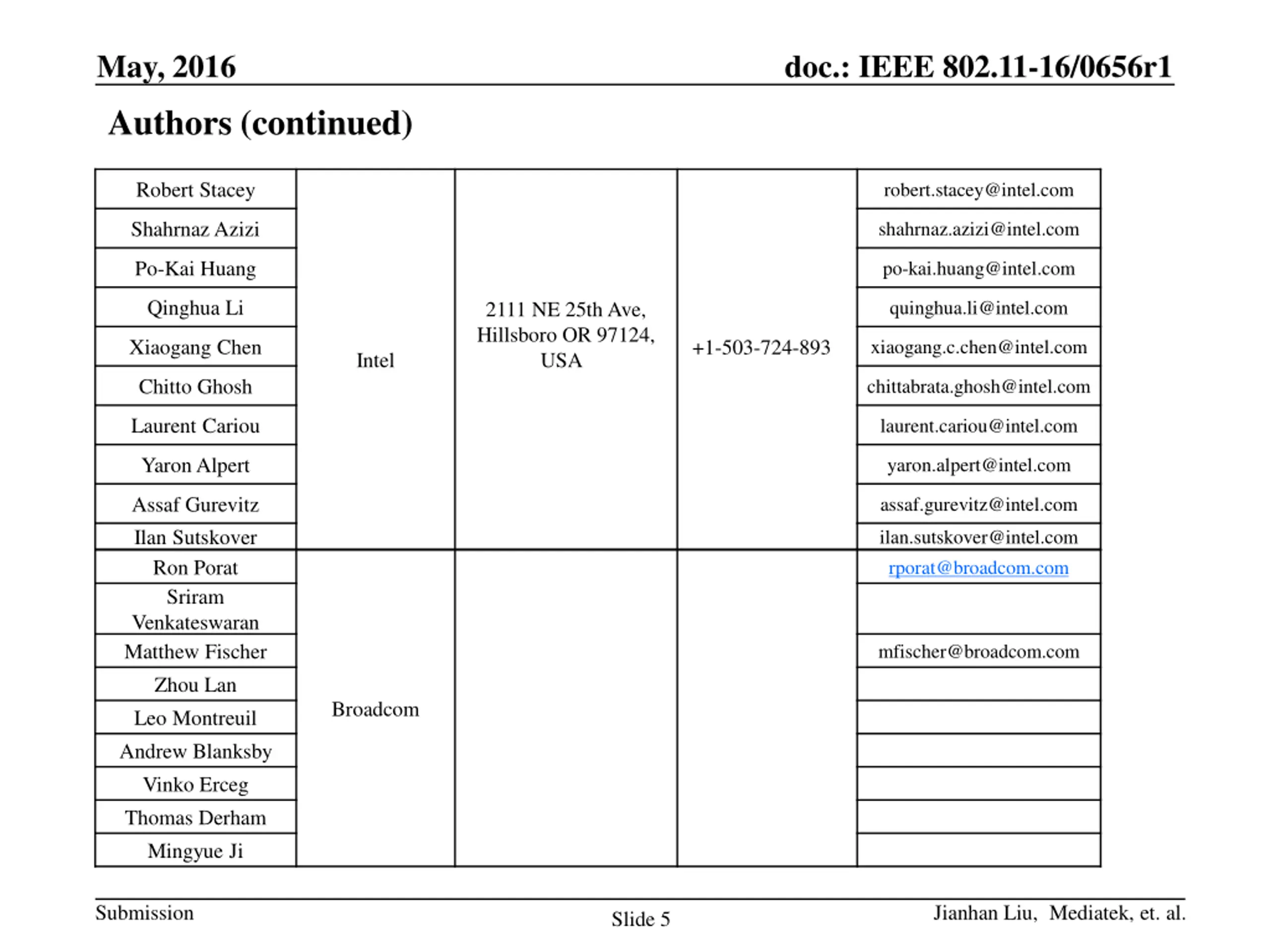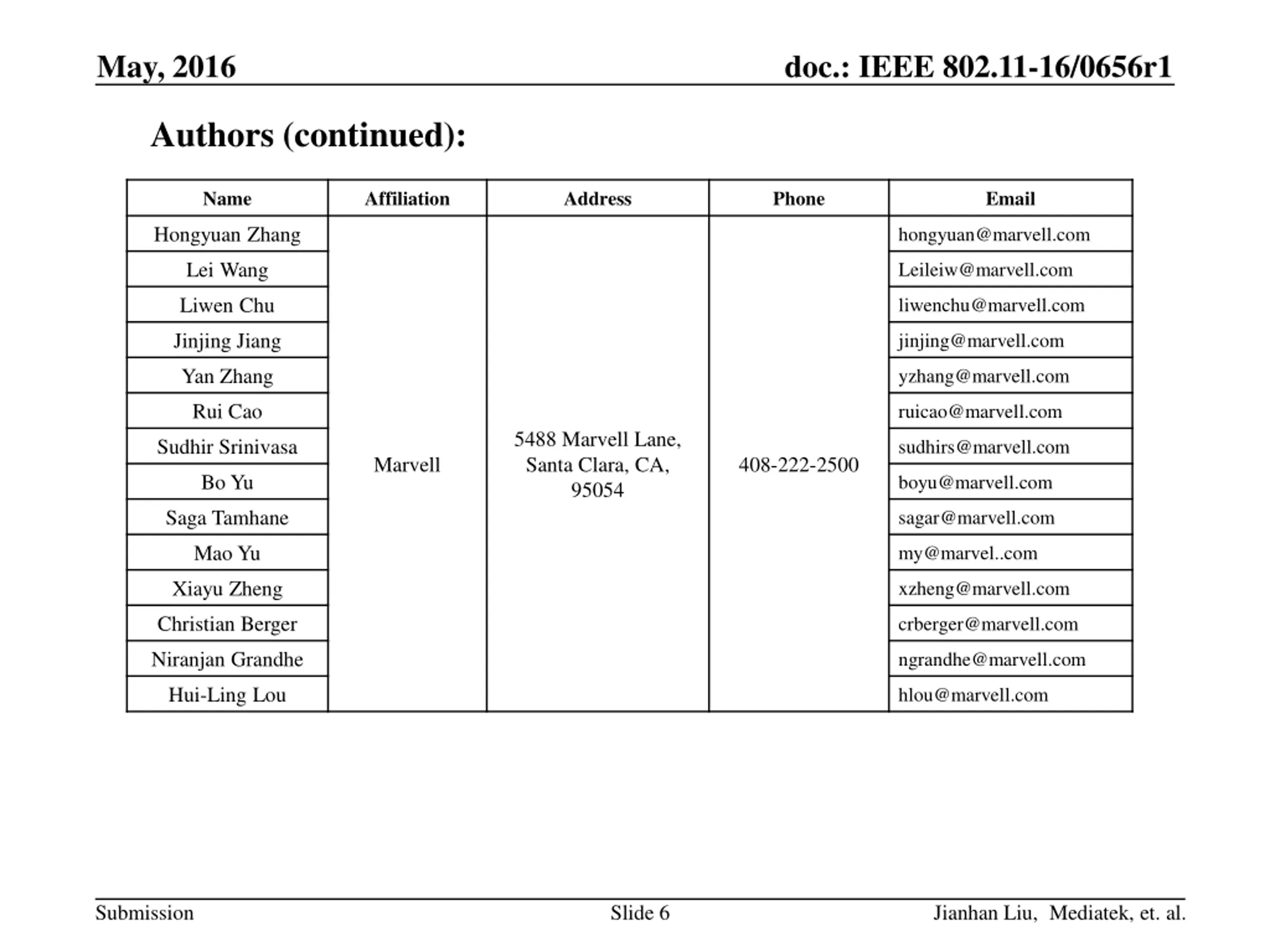 May, 2016 doc.: IEEE 802.11-16/0656r1 Authors (continued) Robert Stacey robert.stacey@intel.com Shahrnaz Azizi shahrnaz.azizi@intel.com Po-Kai Huang po-kai.huang@intel.com Qinghua Li quinghua.li@intel.com 2111 NE 25th Ave, Hillsboro OR 97124, USA Xiaogang Chen +1-503-724-893 xiaogang.c.chen@intel.com Intel Chitto Ghosh chittabrata.ghosh@intel.com Laurent Cariou laurent.cariou@intel.com Yaron Alpert yaron.alpert@intel.com Assaf Gurevitz Ilan Sutskover assaf.gurevitz@intel.com ilan.sutskover@intel.com Ron Porat Sriram Venkateswaran Matthew Fischer Zhou Lan Leo Montreuil Andrew Blanksby Vinko Erceg Thomas Derham Mingyue Ji rporat@broadcom.com mfischer@broadcom.com Broadcom Submission Jianhan Liu, Mediatek, et. al. Slide 5