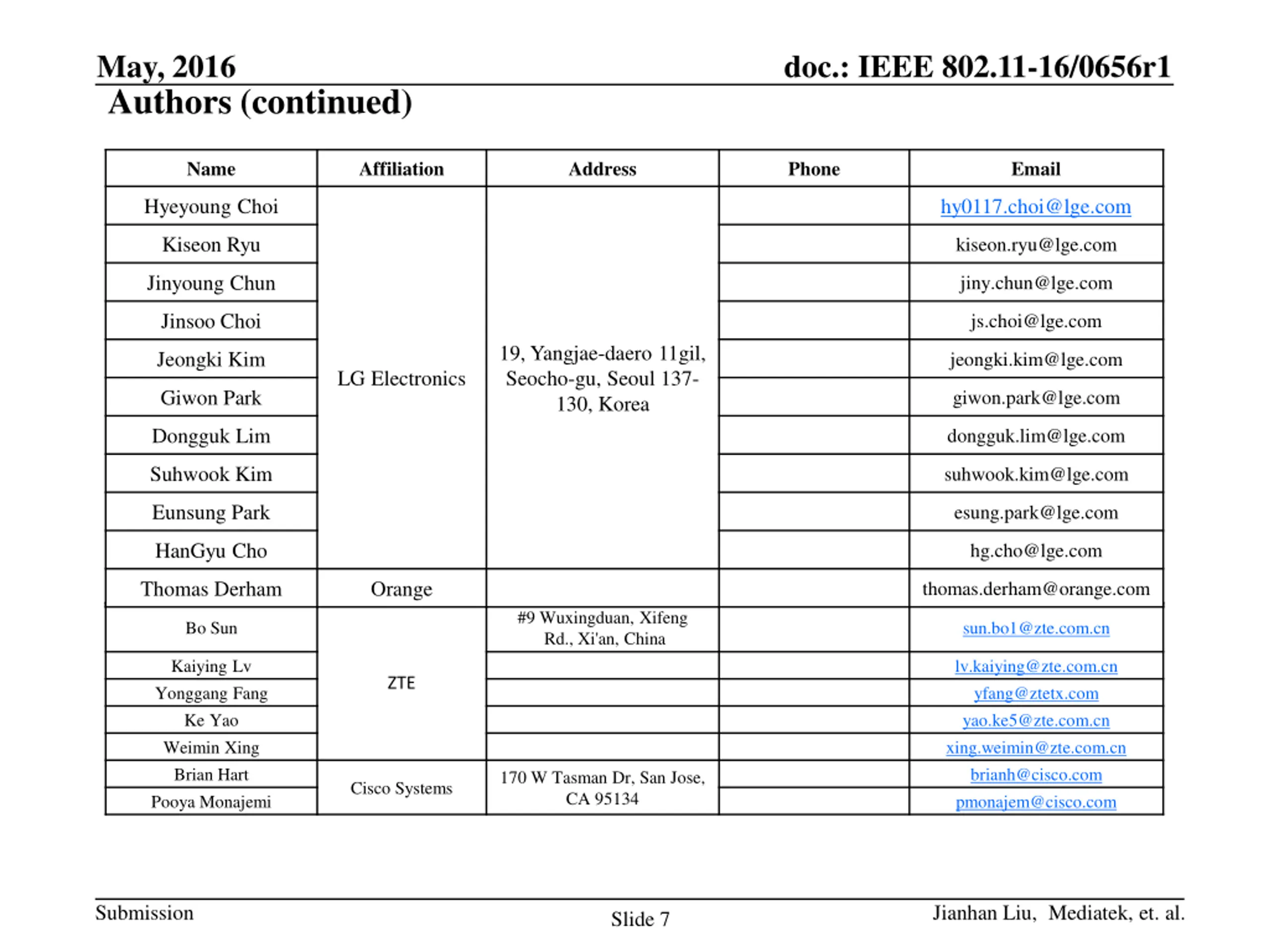 May, 2016 doc.: IEEE 802.11-16/0656r1 Authors (continued): Name Affiliation Address Phone Email Hongyuan Zhang hongyuan@marvell.com Lei Wang Leileiw@marvell.com Liwen Chu liwenchu@marvell.com Jinjing Jiang jinjing@marvell.com Yan Zhang yzhang@marvell.com Rui Cao ruicao@marvell.com 5488 Marvell Lane, Santa Clara, CA, 95054 Sudhir Srinivasa sudhirs@marvell.com Marvell 408-222-2500 Bo Yu boyu@marvell.com Saga Tamhane sagar@marvell.com Mao Yu my@marvel..com Xiayu Zheng xzheng@marvell.com Christian Berger crberger@marvell.com Niranjan Grandhe ngrandhe@marvell.com Hui-Ling Lou hlou@marvell.com Submission Slide 6 Jianhan Liu, Mediatek, et. al.