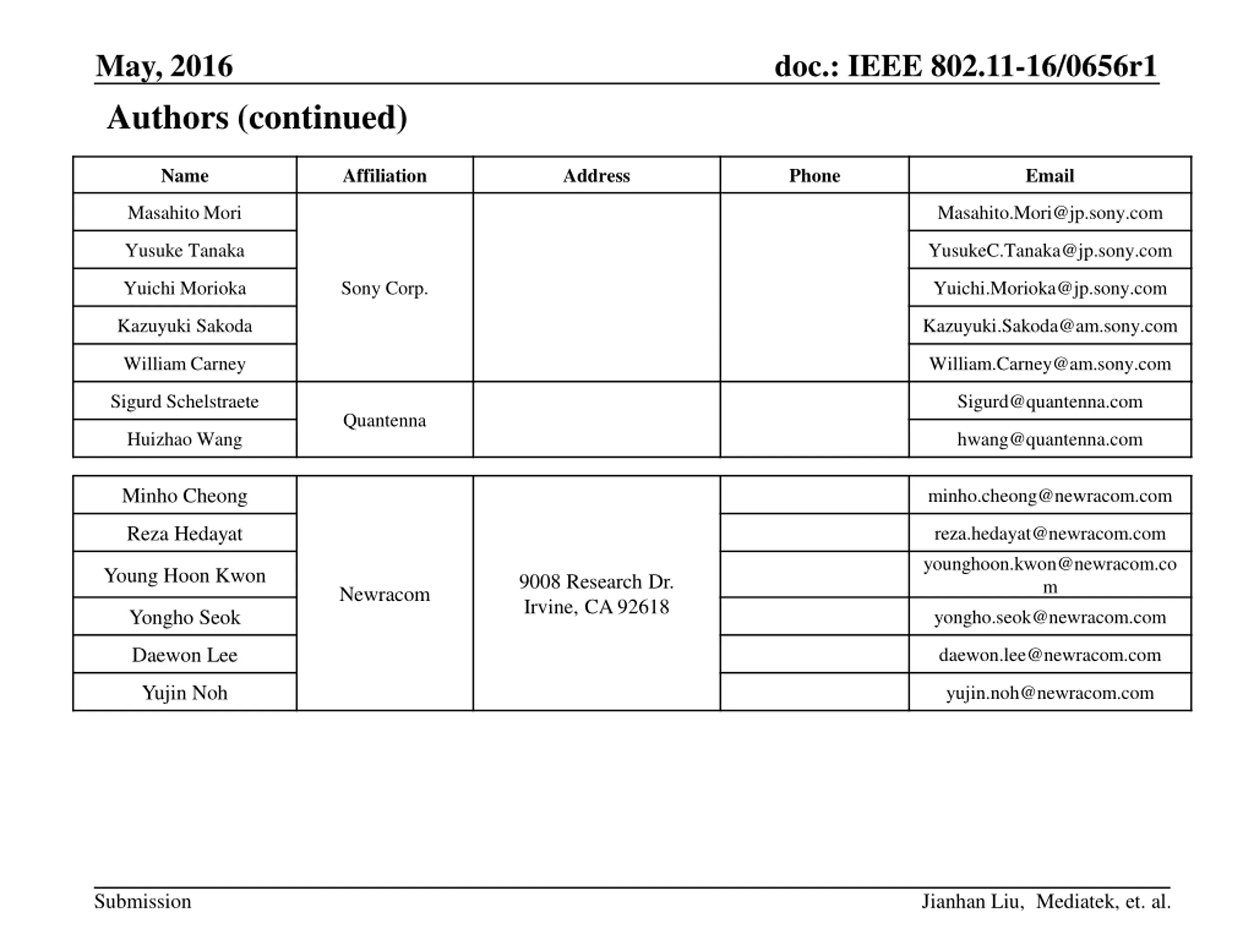 May, 2016 Authors (continued) doc.: IEEE 802.11-16/0656r1 Authors (continued) Authors (continued) Masahito Mori Name Affiliation Address Phone Email Masahito.Mori@jp.sony.com Yusuke Tanaka YusukeC.Tanaka@jp.sony.com Yuichi Morioka Sony Corp. Yuichi.Morioka@jp.sony.com Kazuyuki Sakoda Kazuyuki.Sakoda@am.sony.com William Carney William.Carney@am.sony.com Sigurd Schelstraete Sigurd@quantenna.com Quantenna Huizhao Wang hwang@quantenna.com Minho Cheong minho.cheong@newracom.com Reza Hedayat reza.hedayat@newracom.com younghoon.kwon@newracom.co m yongho.seok@newracom.com Young Hoon Kwon 9008 Research Dr. Irvine, CA 92618 Newracom Yongho Seok Daewon Lee daewon.lee@newracom.com Yujin Noh yujin.noh@newracom.com Submission Jianhan Liu, Mediatek, et. al.