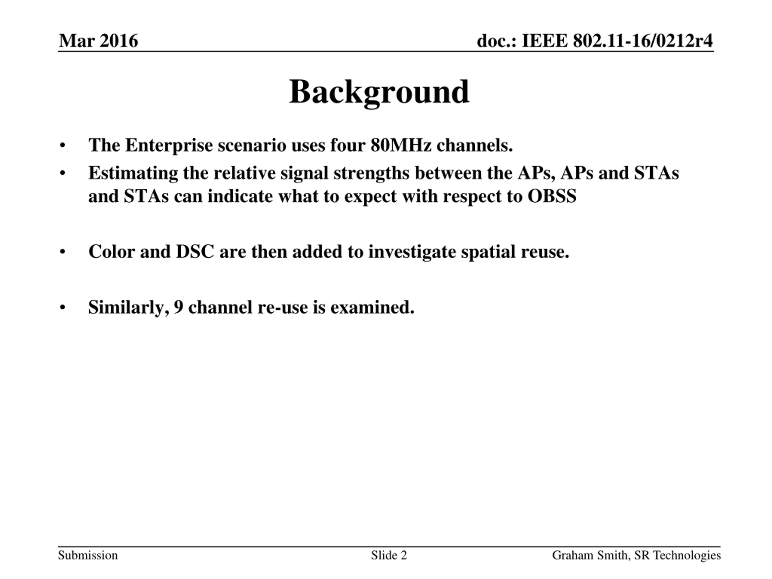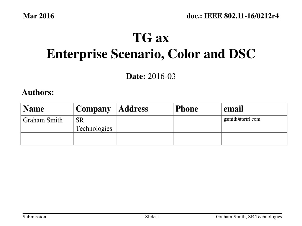 Mar 2016 doc.: IEEE 802.11-16/0212r4 TG ax Enterprise Scenario, Color and DSC Date: 2016-03 Authors: Name Graham Smith Company Address SR Technologies Phone email gsmith@srtrl.com Submission Slide 1 Graham Smith, SR Technologies