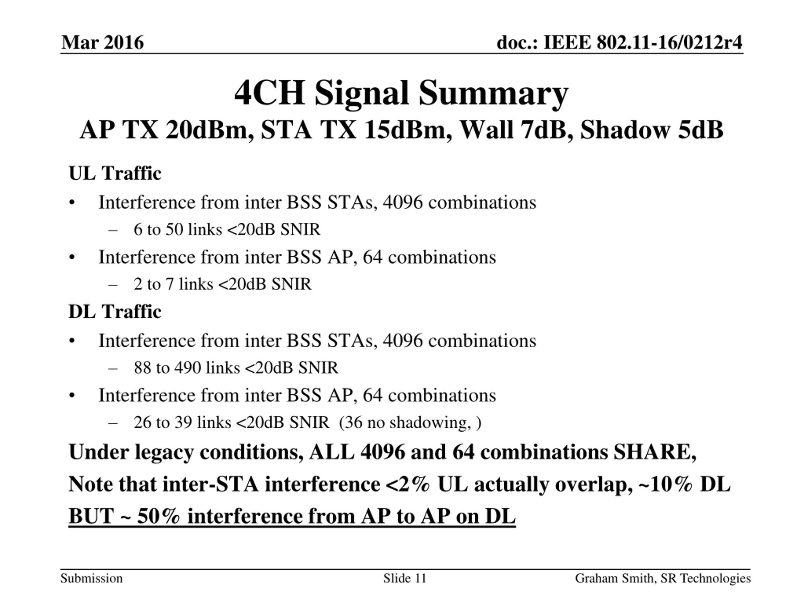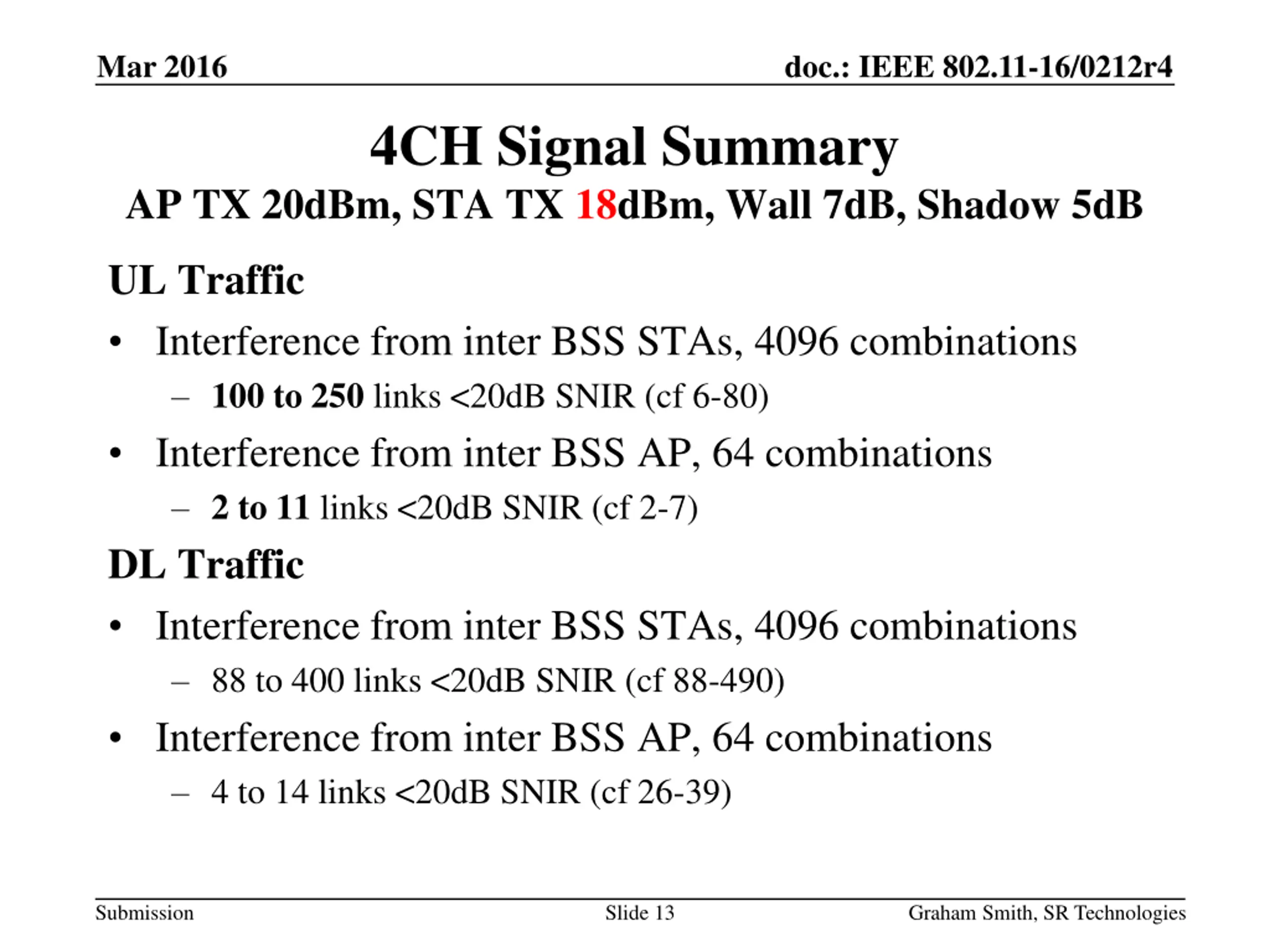 Mar 2016 doc.: IEEE 802.11-16/0212r4 4CH Signal Summary AP TX 20dBm, STA TX 15dBm, Wall 7dB, Shadow 5dB UL Traffic Interference from inter BSS STAs, 4096 combinations 6 to 50 links <20dB SNIR Interference from inter BSS AP, 64 combinations 2 to 7 links <20dB SNIR DL Traffic Interference from inter BSS STAs, 4096 combinations 88 to 490 links <20dB SNIR Interference from inter BSS AP, 64 combinations 26 to 39 links <20dB SNIR (36 no shadowing, ) Under legacy conditions, ALL 4096 and 64 combinations SHARE, Note that inter-STA interference <2% UL actually overlap, ~10% DL BUT ~ 50% interference from AP to AP on DL Submission Slide 11 Graham Smith, SR Technologies
