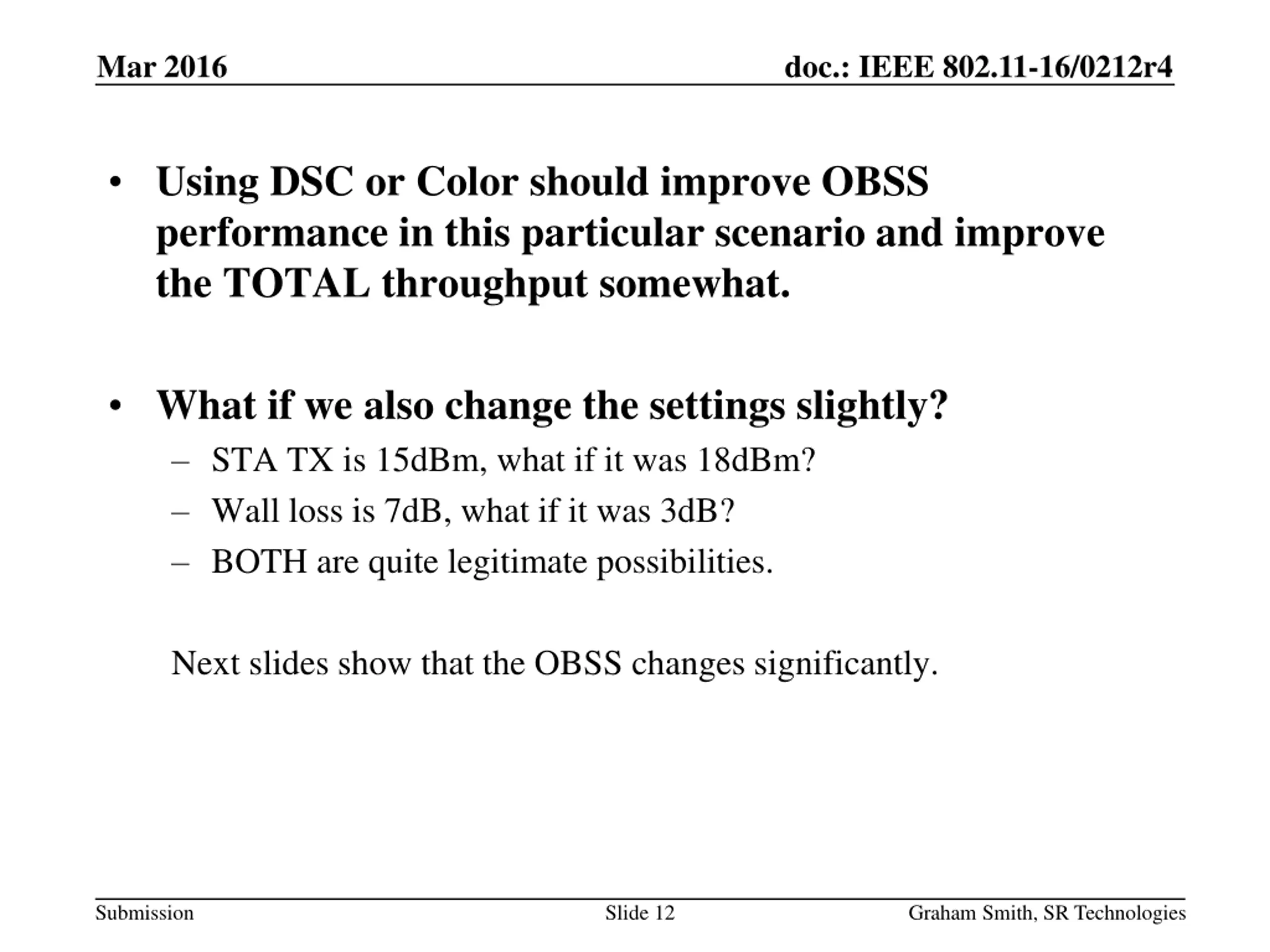 Mar 2016 doc.: IEEE 802.11-16/0212r4 Using DSC or Color should improve OBSS performance in this particular scenario and improve the TOTAL throughput somewhat. What if we also change the settings slightly? STA TX is 15dBm, what if it was 18dBm? Wall loss is 7dB, what if it was 3dB? BOTH are quite legitimate possibilities. Next slides show that the OBSS changes significantly. Submission Slide 12 Graham Smith, SR Technologies