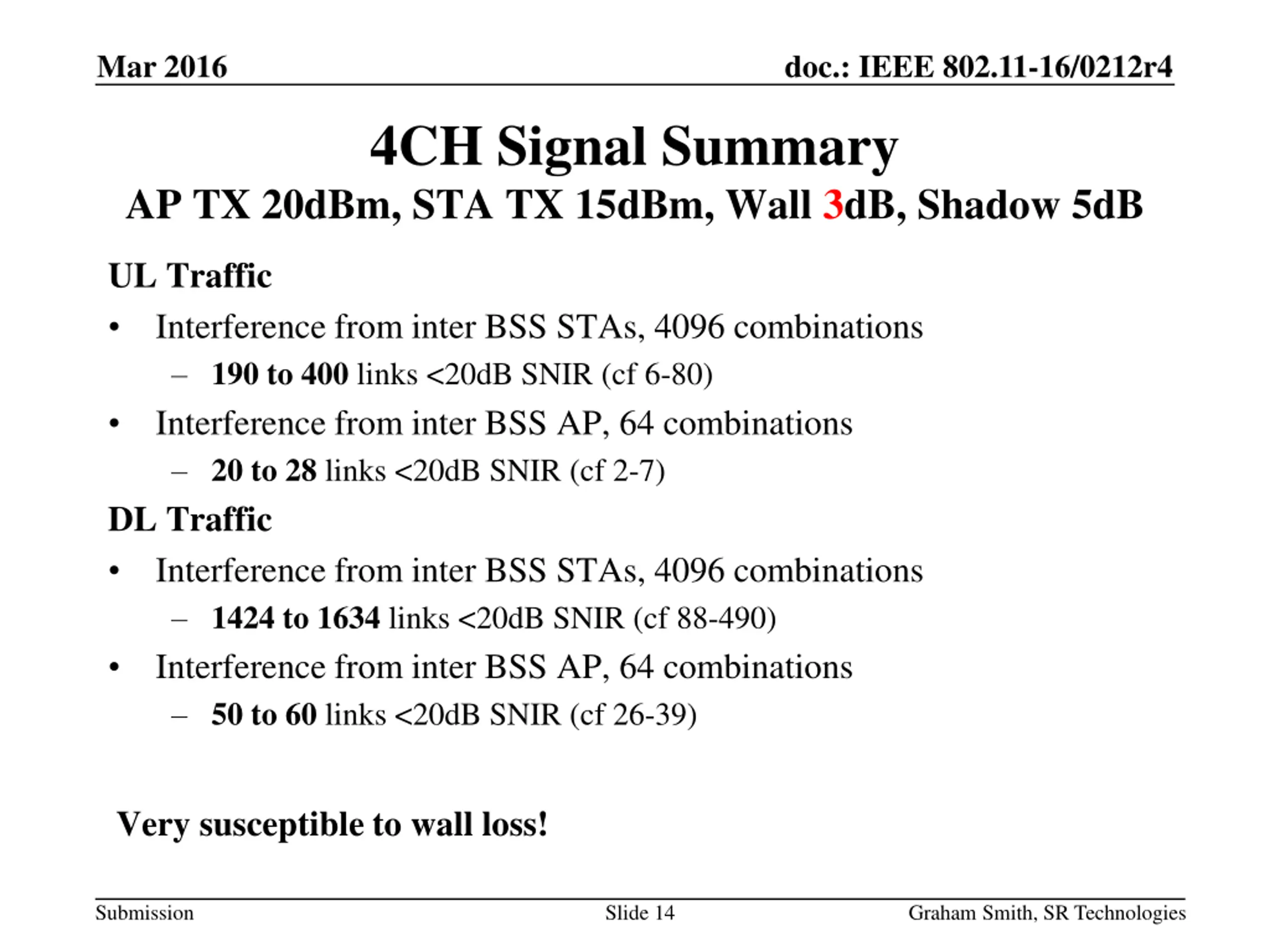 Mar 2016 doc.: IEEE 802.11-16/0212r4 4CH Signal Summary AP TX 20dBm, STA TX 18dBm, Wall 7dB, Shadow 5dB UL Traffic Interference from inter BSS STAs, 4096 combinations 100 to 250 links <20dB SNIR (cf 6-80) Interference from inter BSS AP, 64 combinations 2 to 11 links <20dB SNIR (cf 2-7) DL Traffic Interference from inter BSS STAs, 4096 combinations 88 to 400 links <20dB SNIR (cf 88-490) Interference from inter BSS AP, 64 combinations 4 to 14 links <20dB SNIR (cf 26-39) Submission Slide 13 Graham Smith, SR Technologies