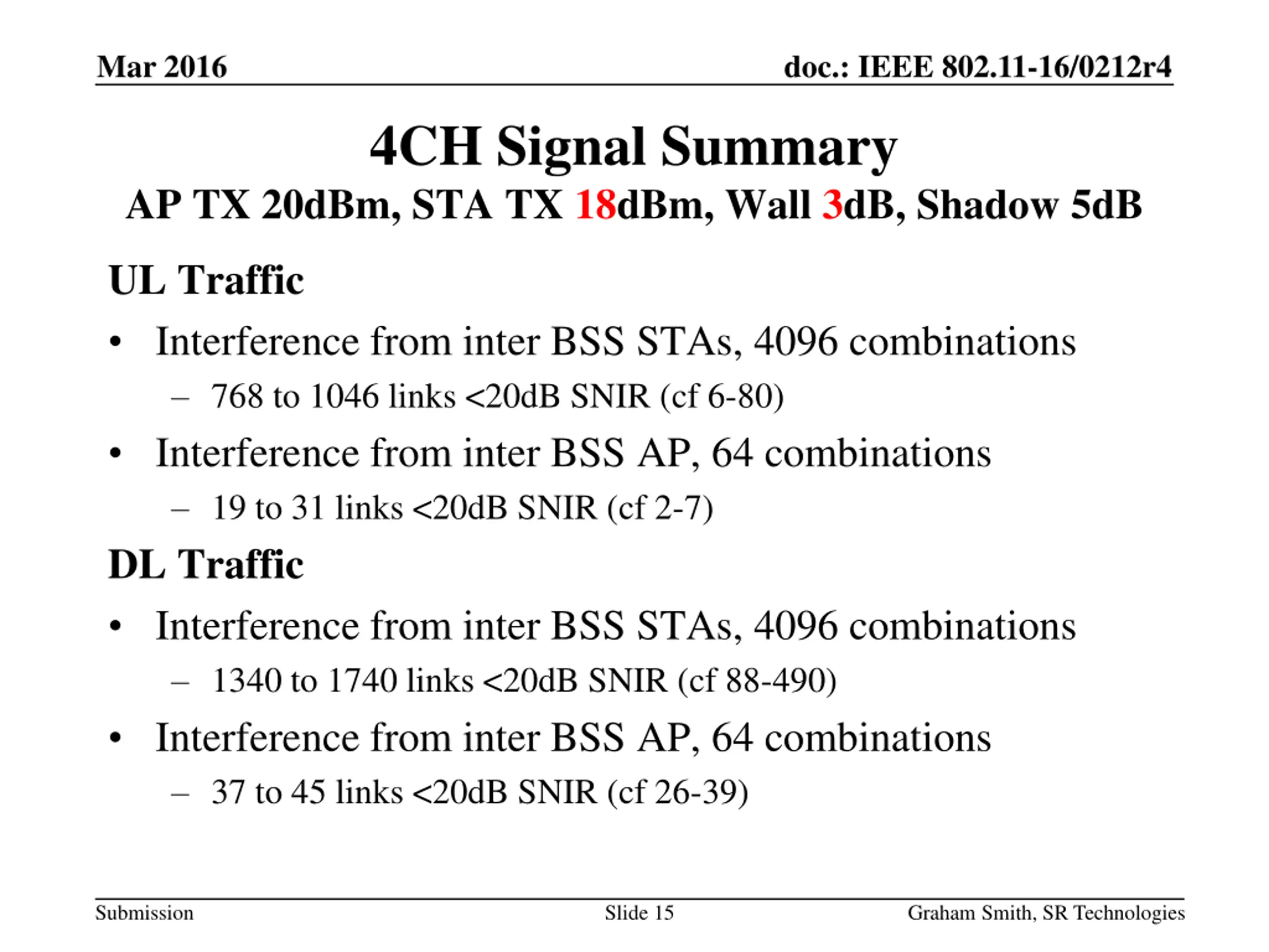 Mar 2016 doc.: IEEE 802.11-16/0212r4 4CH Signal Summary AP TX 20dBm, STA TX 15dBm, Wall 3dB, Shadow 5dB UL Traffic Interference from inter BSS STAs, 4096 combinations 190 to 400 links <20dB SNIR (cf 6-80) Interference from inter BSS AP, 64 combinations 20 to 28 links <20dB SNIR (cf 2-7) DL Traffic Interference from inter BSS STAs, 4096 combinations 1424 to 1634 links <20dB SNIR (cf 88-490) Interference from inter BSS AP, 64 combinations 50 to 60 links <20dB SNIR (cf 26-39) Very susceptible to wall loss! Submission Slide 14 Graham Smith, SR Technologies