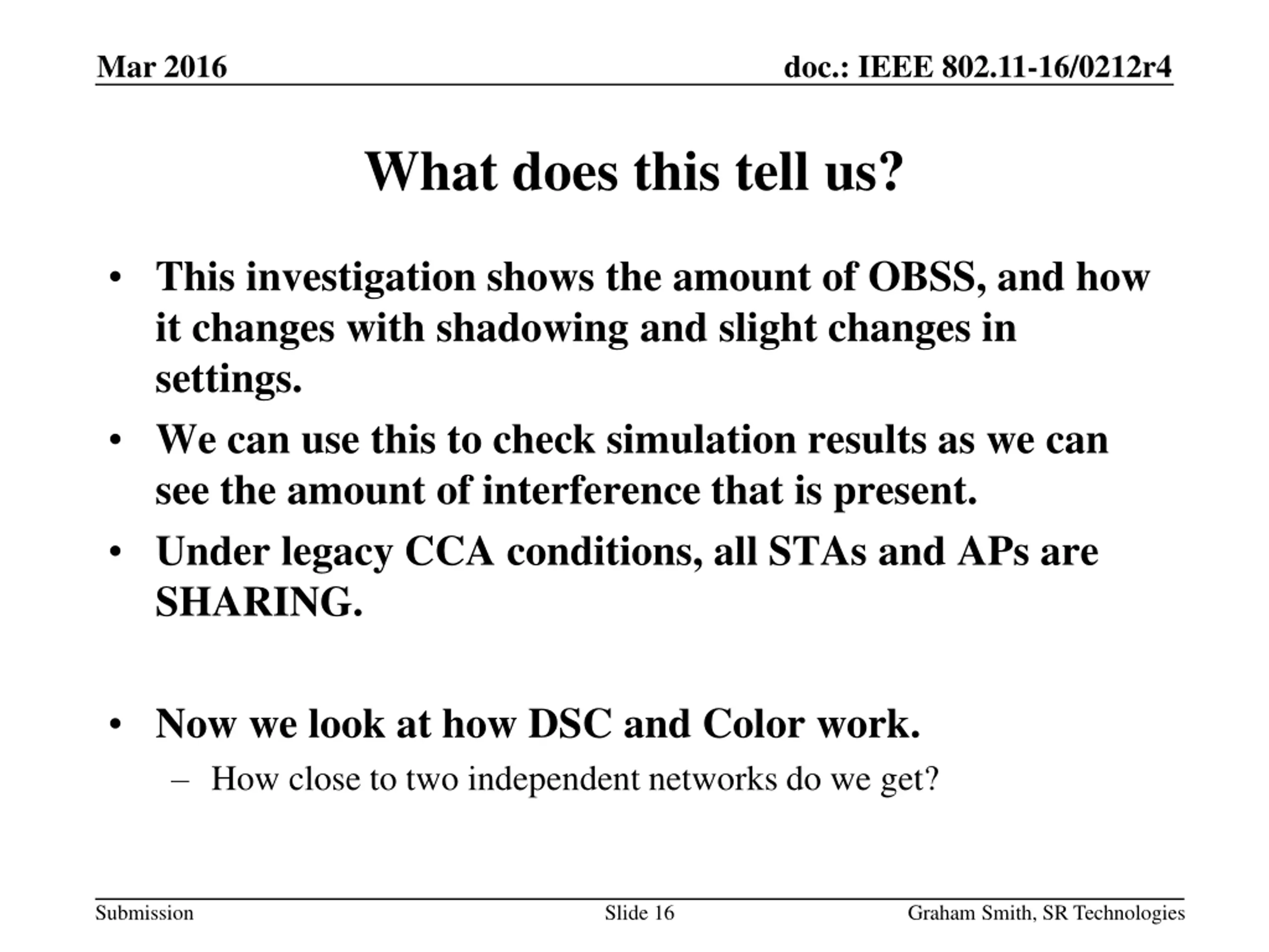 Mar 2016 doc.: IEEE 802.11-16/0212r4 What does this tell us? This investigation shows the amount of OBSS, and how it changes with shadowing and slight changes in settings. We can use this to check simulation results as we can see the amount of interference that is present. Under legacy CCA conditions, all STAs and APs are SHARING. Now we look at how DSC and Color work. How close to two independent networks do we get? Submission Slide 16 Graham Smith, SR Technologies