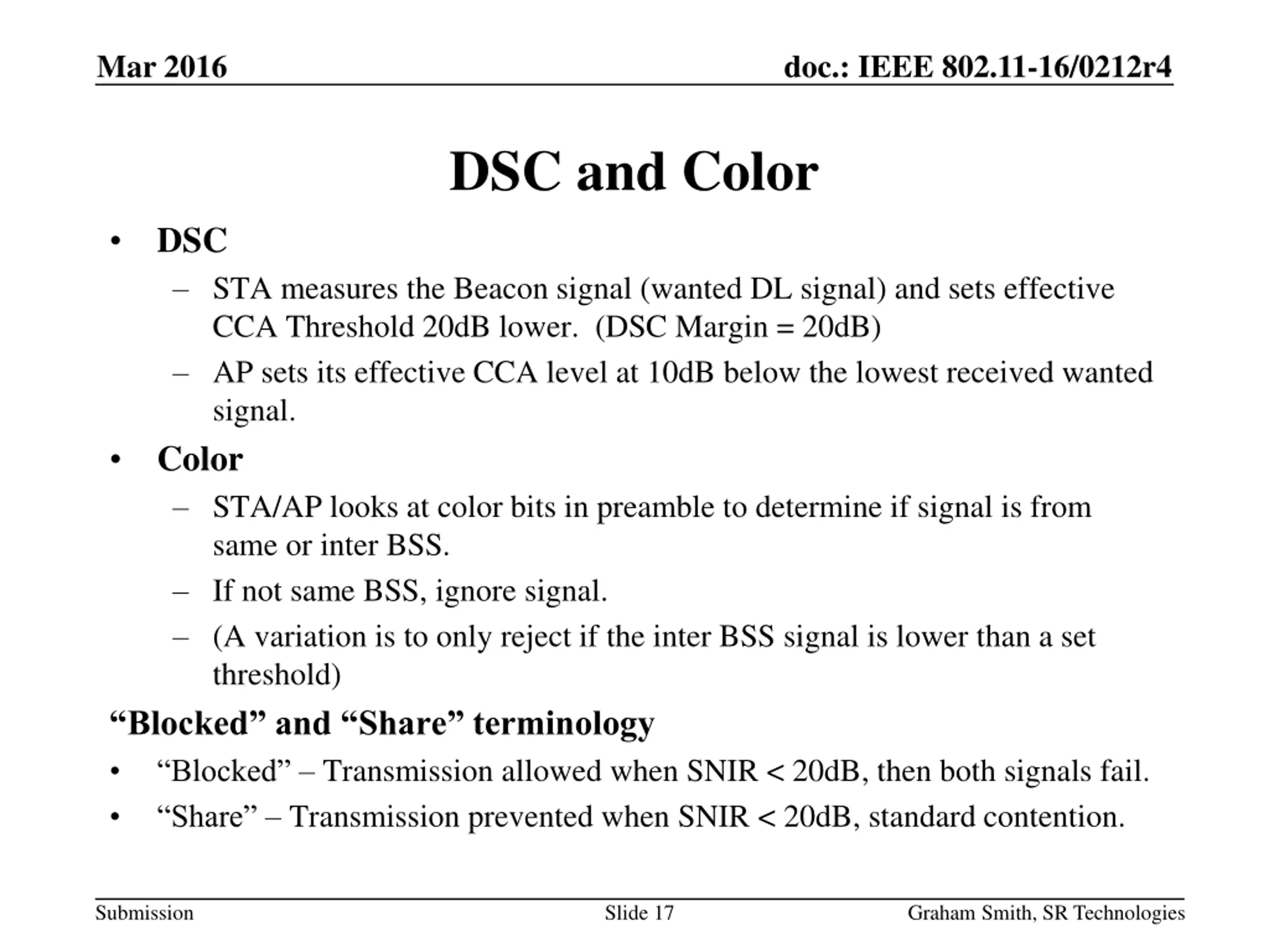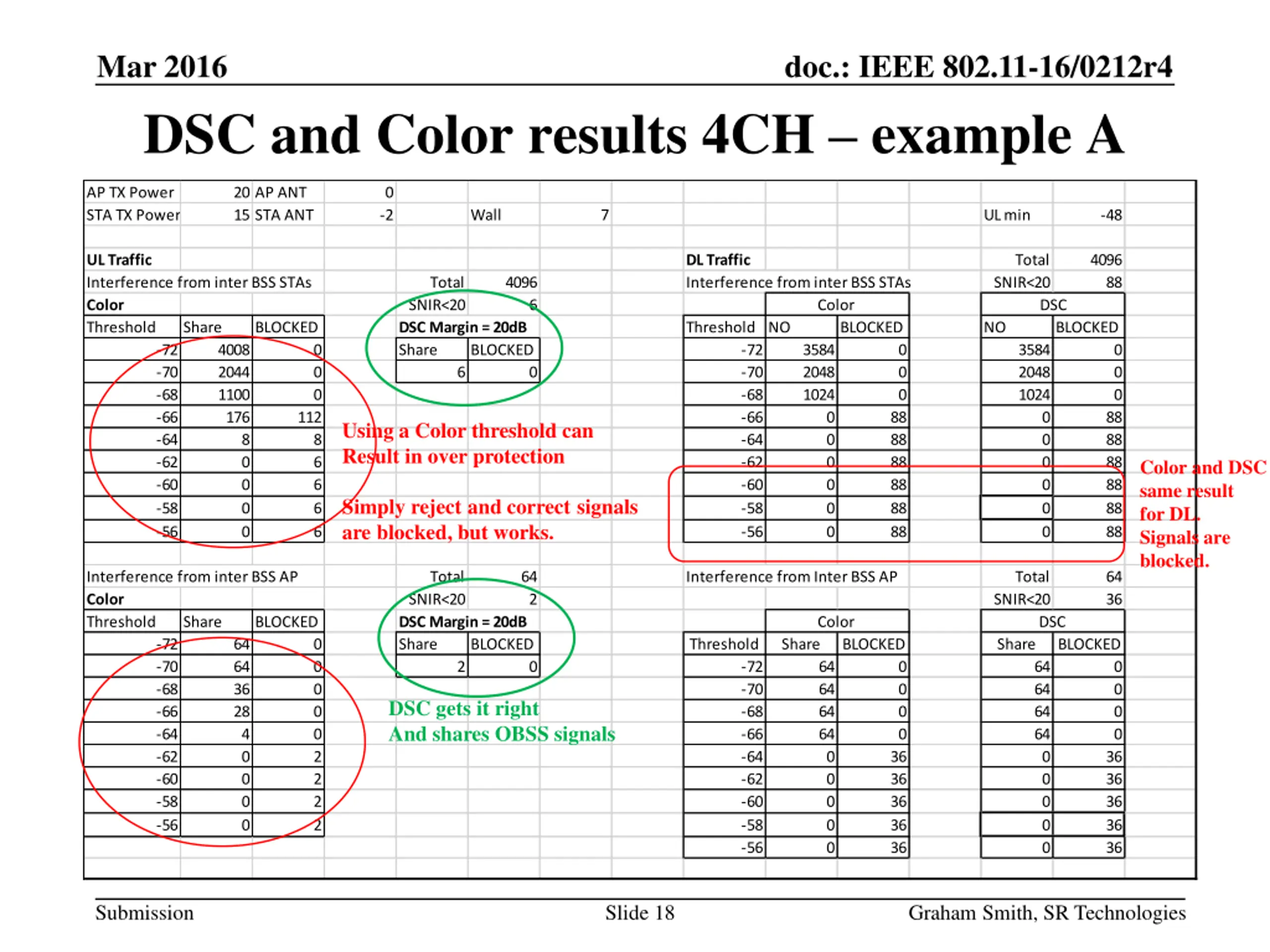 Mar 2016 doc.: IEEE 802.11-16/0212r4 DSC and Color DSC STA measures the Beacon signal (wanted DL signal) and sets effective CCA Threshold 20dB lower. (DSC Margin = 20dB) AP sets its effective CCA level at 10dB below the lowest received wanted signal. Color STA/AP looks at color bits in preamble to determine if signal is from same or inter BSS. If not same BSS, ignore signal. (A variation is to only reject if the inter BSS signal is lower than a set threshold) Blocked and Share terminology Blocked Transmission allowed when SNIR < 20dB, then both signals fail. Share Transmission prevented when SNIR < 20dB, standard contention. Submission Slide 17 Graham Smith, SR Technologies