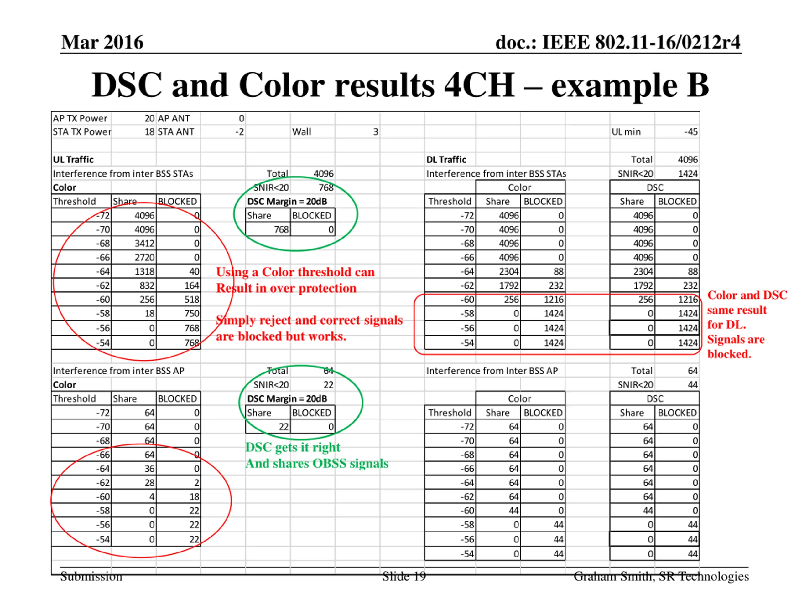 Mar 2016 doc.: IEEE 802.11-16/0212r4 DSC and Color results 4CH example B AP TX Power STA TX Power 20 AP ANT 18 STA ANT 0 -2 Wall 3 UL min -45 UL Traffic Interference from inter BSS STAs Color Threshold Share -72 -70 -68 -66 -64 -62 -60 -58 -56 -54 DL Traffic Interference from inter BSS STAs Total 4096 1424 Total 4096 768 SNIR<20 SNIR<20 DSC Margin = 20dB Share 768 Color DSC BLOCKED Threshold Share BLOCKED Share BLOCKED 4096 4096 3412 2720 1318 832 256 18 0 0 0 0 BLOCKED -72 -70 -68 -66 -64 -62 -60 -58 -56 -54 4096 4096 4096 4096 2304 1792 256 0 0 0 0 4096 4096 4096 4096 2304 1792 256 0 0 0 0 0 Using a Color threshold can Result in over protection 40 164 518 750 768 768 88 232 1216 1424 1424 1424 88 232 1216 1424 1424 1424 Color and DSC same result for DL. Signals are blocked. 0 0 0 0 0 0 Simply reject and correct signals are blocked but works. 0 0 Interference from inter BSS AP Color Threshold Share -72 -70 -68 -66 -64 -62 -60 -58 -56 -54 Total 64 22 Interference from Inter BSS AP Total 64 44 SNIR<20 DSC Margin = 20dB Share 22 DSC gets it right And shares OBSS signals SNIR<20 BLOCKED Color DSC 64 64 64 64 36 28 4 0 0 0 0 0 0 0 0 2 BLOCKED Threshold Share BLOCKED Share BLOCKED 0 -72 -70 -68 -66 -64 -62 -60 -58 -56 -54 64 64 64 64 64 64 44 0 0 0 0 0 0 0 0 0 0 64 64 64 64 64 64 44 0 0 0 0 0 0 0 0 0 0 18 22 22 22 44 44 44 44 44 44 Submission Slide 19 Graham Smith, SR Technologies