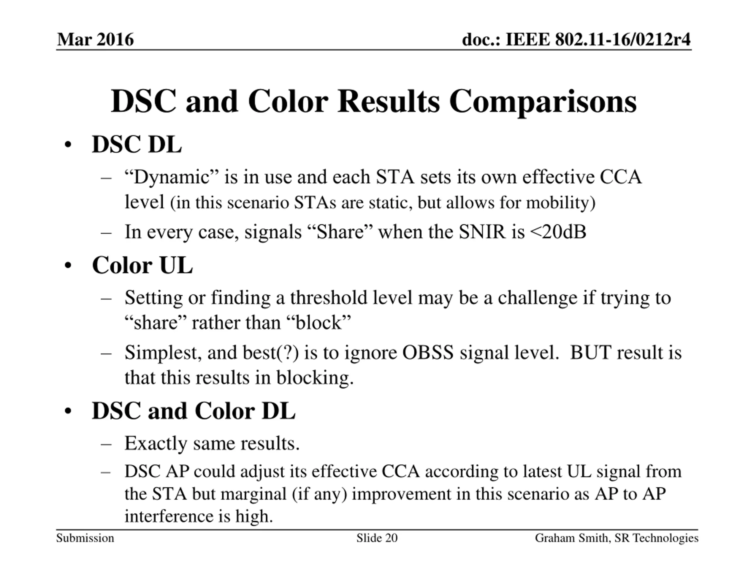 Mar 2016 doc.: IEEE 802.11-16/0212r4 DSC and Color Results Comparisons DSC DL Dynamic is in use and each STA sets its own effective CCA level (in this scenario STAs are static, but allows for mobility) In every case, signals Share when the SNIR is <20dB Color UL Setting or finding a threshold level may be a challenge if trying to share rather than block Simplest, and best(?) is to ignore OBSS signal level. BUT result is that this results in blocking. DSC and Color DL Exactly same results. DSC AP could adjust its effective CCA according to latest UL signal from the STA but marginal (if any) improvement in this scenario as AP to AP interference is high. Slide 20 Submission Graham Smith, SR Technologies
