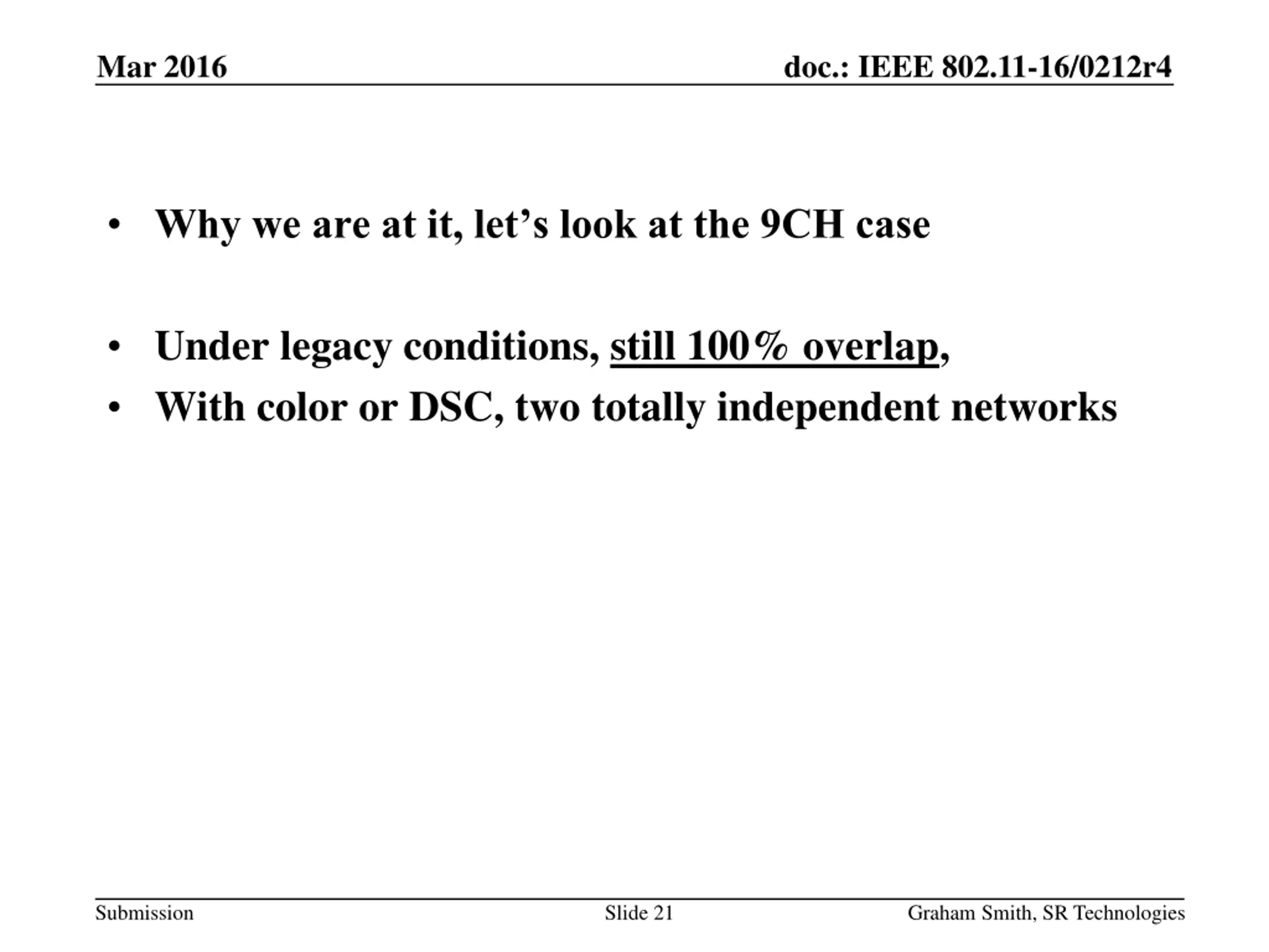 Mar 2016 doc.: IEEE 802.11-16/0212r4 Why we are at it, let s look at the 9CH case Under legacy conditions, still 100% overlap, With color or DSC, two totally independent networks Submission Slide 21 Graham Smith, SR Technologies