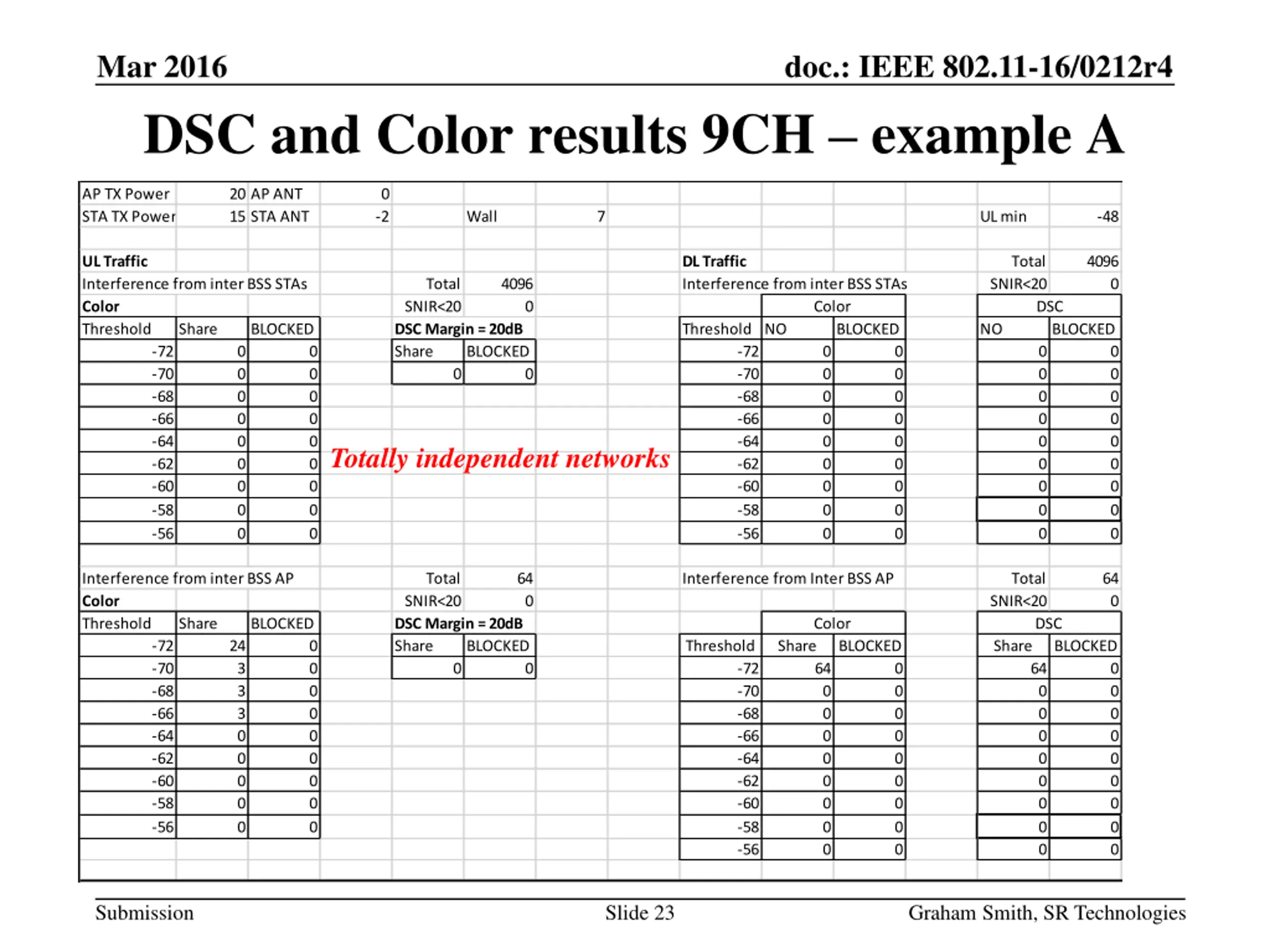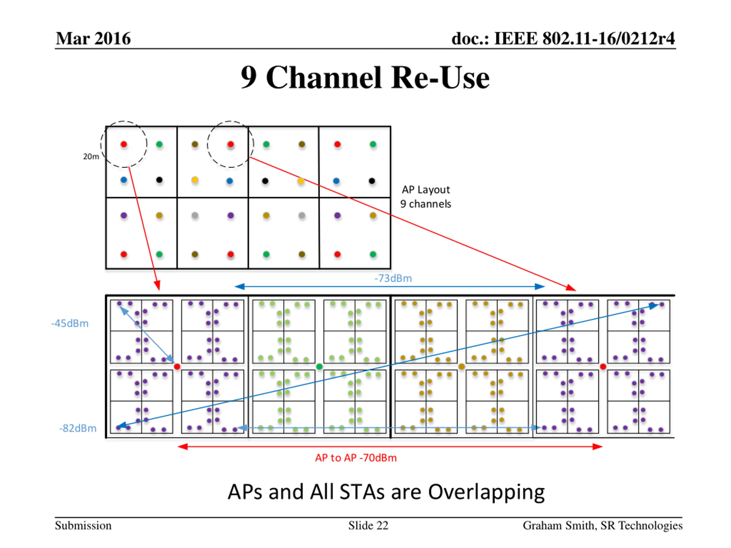 Mar 2016 doc.: IEEE 802.11-16/0212r4 9 Channel Re-Use 20m AP Layout 9 channels -73dBm -45dBm -82dBm AP to AP -70dBm APs and All STAs are Overlapping Submission Slide 22 Graham Smith, SR Technologies