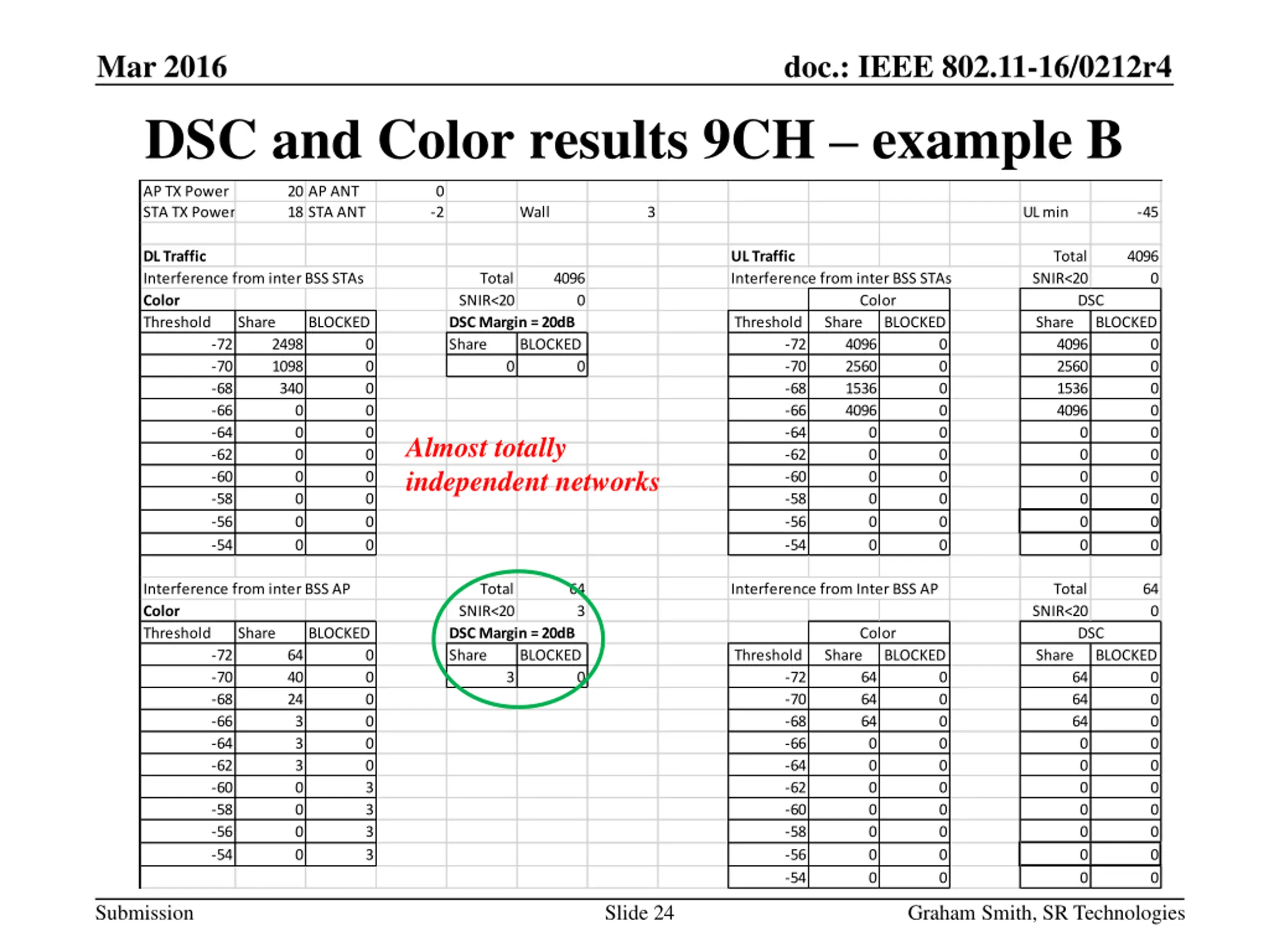 Mar 2016 doc.: IEEE 802.11-16/0212r4 DSC and Color results 9CH example A AP TX Power STA TX Power 20 AP ANT 15 STA ANT 0 -2 Wall 7 UL min -48 UL Traffic Interference from inter BSS STAs Color Threshold Share -72 -70 -68 -66 -64 -62 -60 -58 -56 DL Traffic Interference from inter BSS STAs Total 4096 Total 4096 SNIR<20 0 SNIR<20 DSC Margin = 20dB Share 0 0 Color DSC BLOCKED Threshold NO BLOCKED NO BLOCKED 0 0 0 0 0 0 0 0 0 0 0 0 0 0 0 0 0 0 BLOCKED -72 -70 -68 -66 -64 -62 -60 -58 -56 0 0 0 0 0 0 0 0 0 0 0 0 0 0 0 0 0 0 0 0 0 0 0 0 0 0 0 0 0 0 0 0 0 0 0 0 0 Totally independent networks Interference from inter BSS AP Color Threshold Share -72 -70 -68 -66 -64 -62 -60 -58 -56 Total 64 0 Interference from Inter BSS AP Total 64 0 SNIR<20 DSC Margin = 20dB Share 0 SNIR<20 BLOCKED Color DSC 24 3 3 3 0 0 0 0 0 0 0 0 0 0 0 0 0 0 BLOCKED Threshold Share BLOCKED Share BLOCKED 0 -72 -70 -68 -66 -64 -62 -60 -58 -56 64 0 0 0 0 0 0 0 0 0 0 0 0 0 0 0 0 0 64 0 0 0 0 0 0 0 0 0 0 0 0 0 0 0 0 0 Submission Slide 23 Graham Smith, SR Technologies