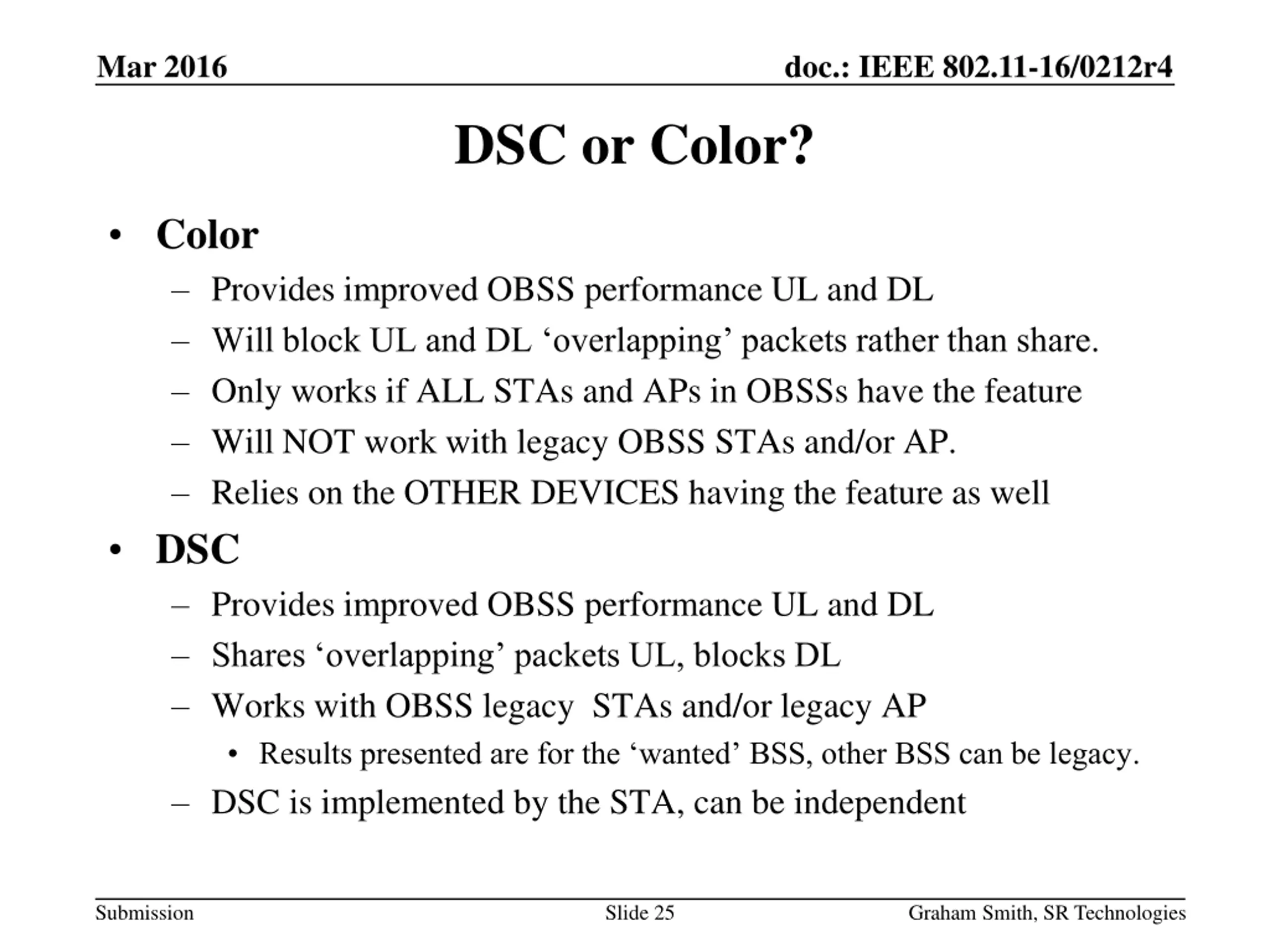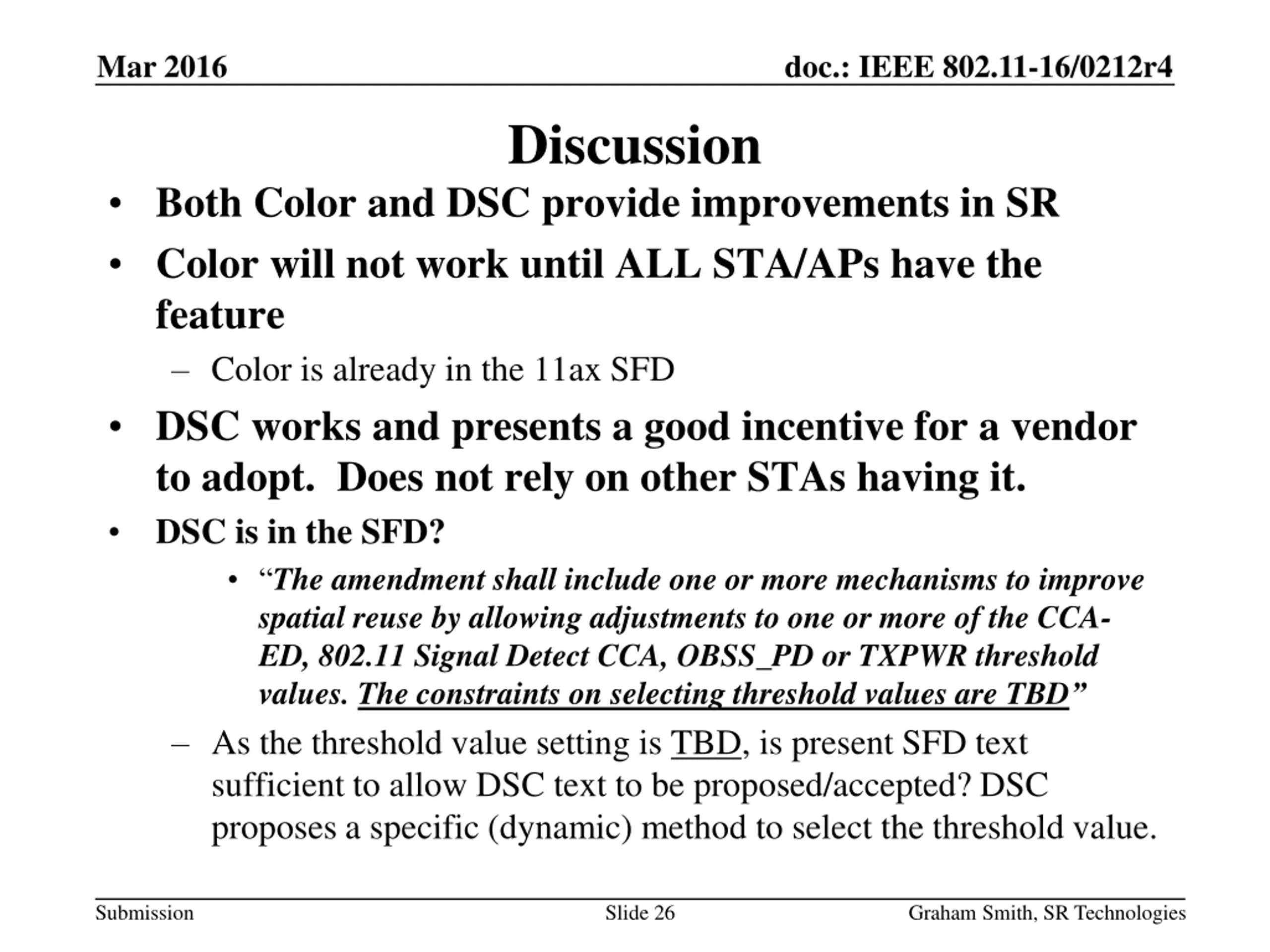 Mar 2016 doc.: IEEE 802.11-16/0212r4 DSC or Color? Color Provides improved OBSS performance UL and DL Will block UL and DL overlapping packets rather than share. Only works if ALL STAs and APs in OBSSs have the feature Will NOT work with legacy OBSS STAs and/or AP. Relies on the OTHER DEVICES having the feature as well DSC Provides improved OBSS performance UL and DL Shares overlapping packets UL, blocks DL Works with OBSS legacy STAs and/or legacy AP Results presented are for the wanted BSS, other BSS can be legacy. DSC is implemented by the STA, can be independent Submission Slide 25 Graham Smith, SR Technologies