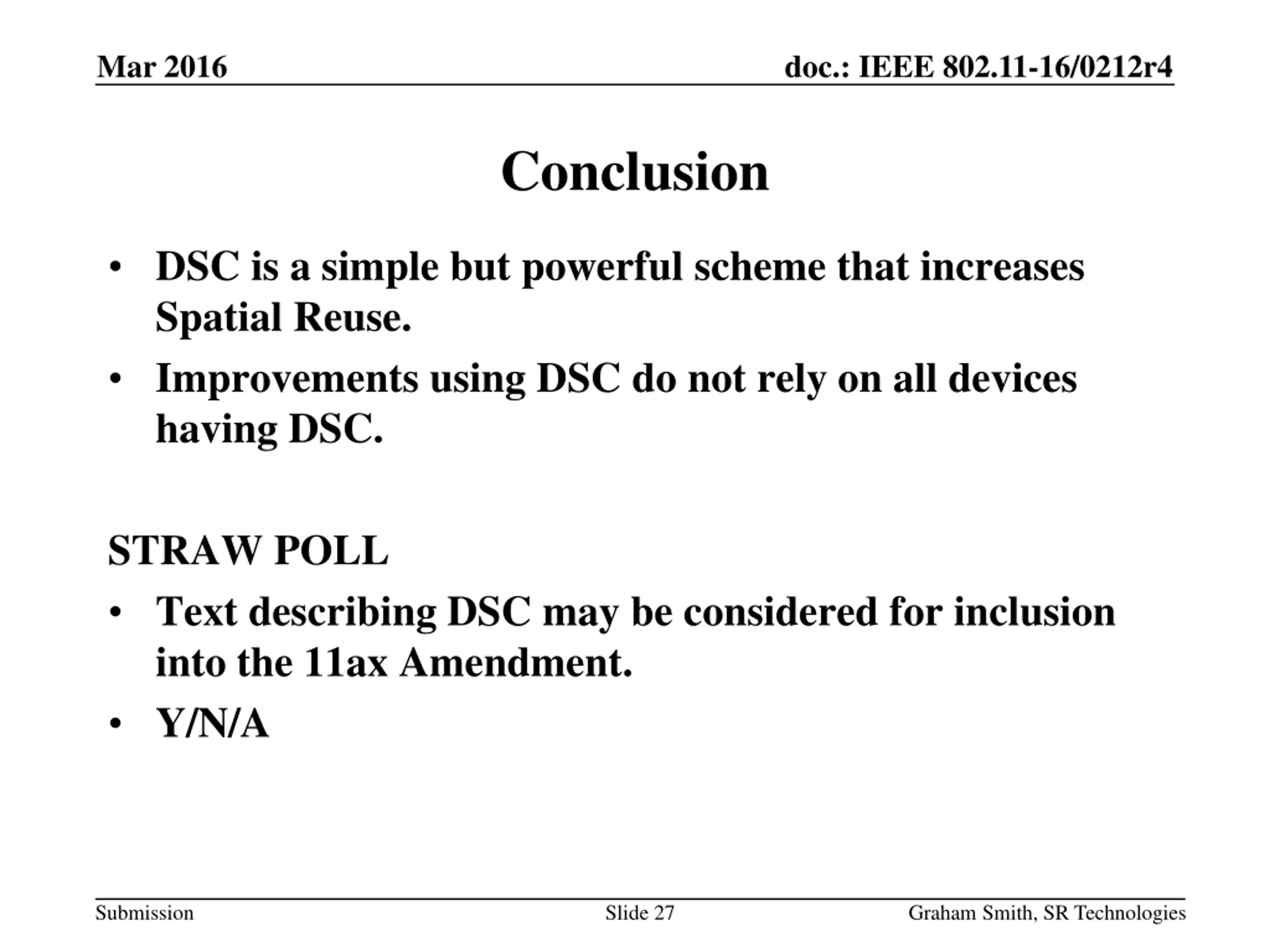 Mar 2016 doc.: IEEE 802.11-16/0212r4 Conclusion DSC is a simple but powerful scheme that increases Spatial Reuse. Improvements using DSC do not rely on all devices having DSC. STRAW POLL Text describing DSC may be considered for inclusion into the 11ax Amendment. Y/N/A Submission Slide 27 Graham Smith, SR Technologies