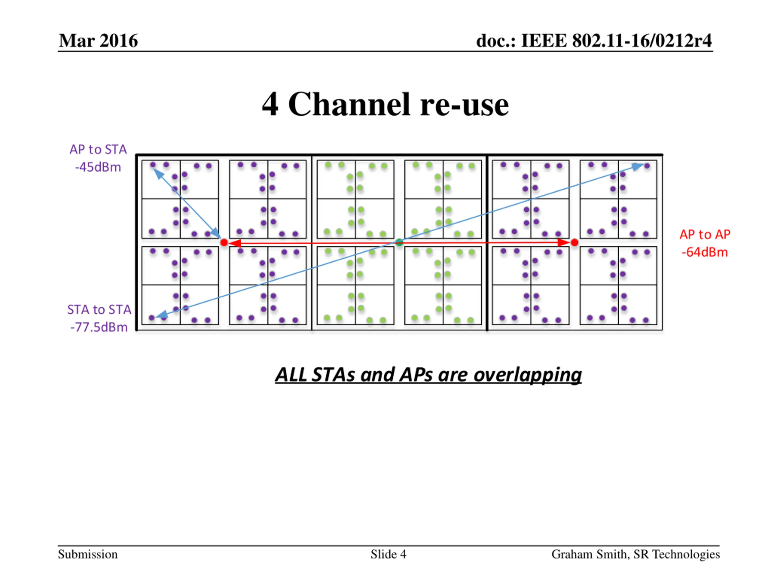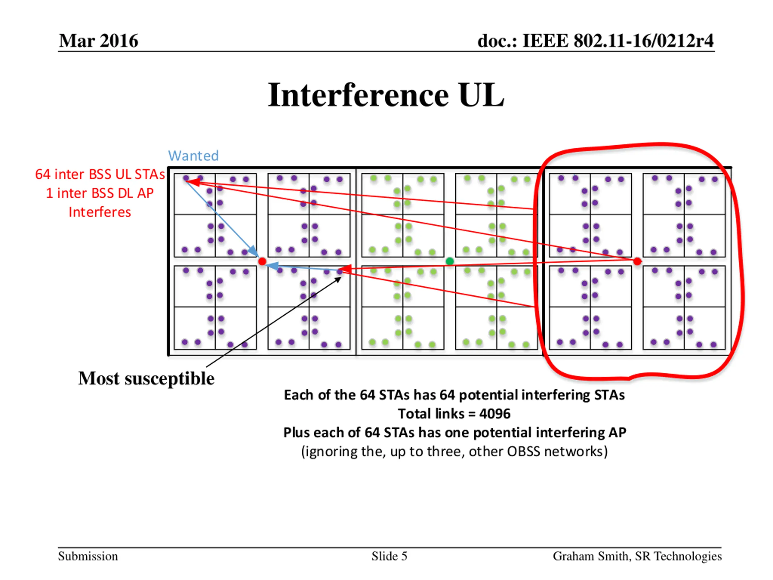 Mar 2016 doc.: IEEE 802.11-16/0212r4 4 Channel re-use AP to STA -45dBm AP to AP -64dBm STA to STA -77.5dBm ALL STAs and APs are overlapping Submission Slide 4 Graham Smith, SR Technologies