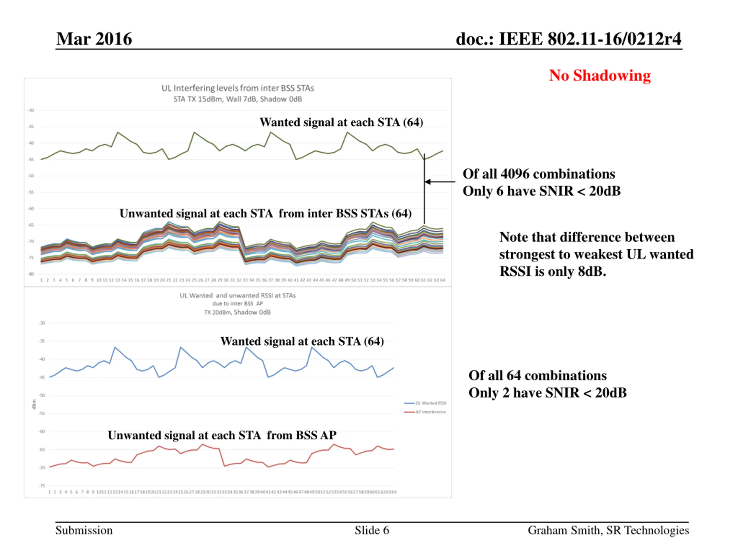 Mar 2016 doc.: IEEE 802.11-16/0212r4 Interference UL Wanted 64 inter BSS UL STAs 1 inter BSS DL AP Interferes Most susceptible Each of the 64 STAs has 64 potential interfering STAs Total links = 4096 Plus each of 64 STAs has one potential interfering AP (ignoring the, up to three, other OBSS networks) Submission Slide 5 Graham Smith, SR Technologies