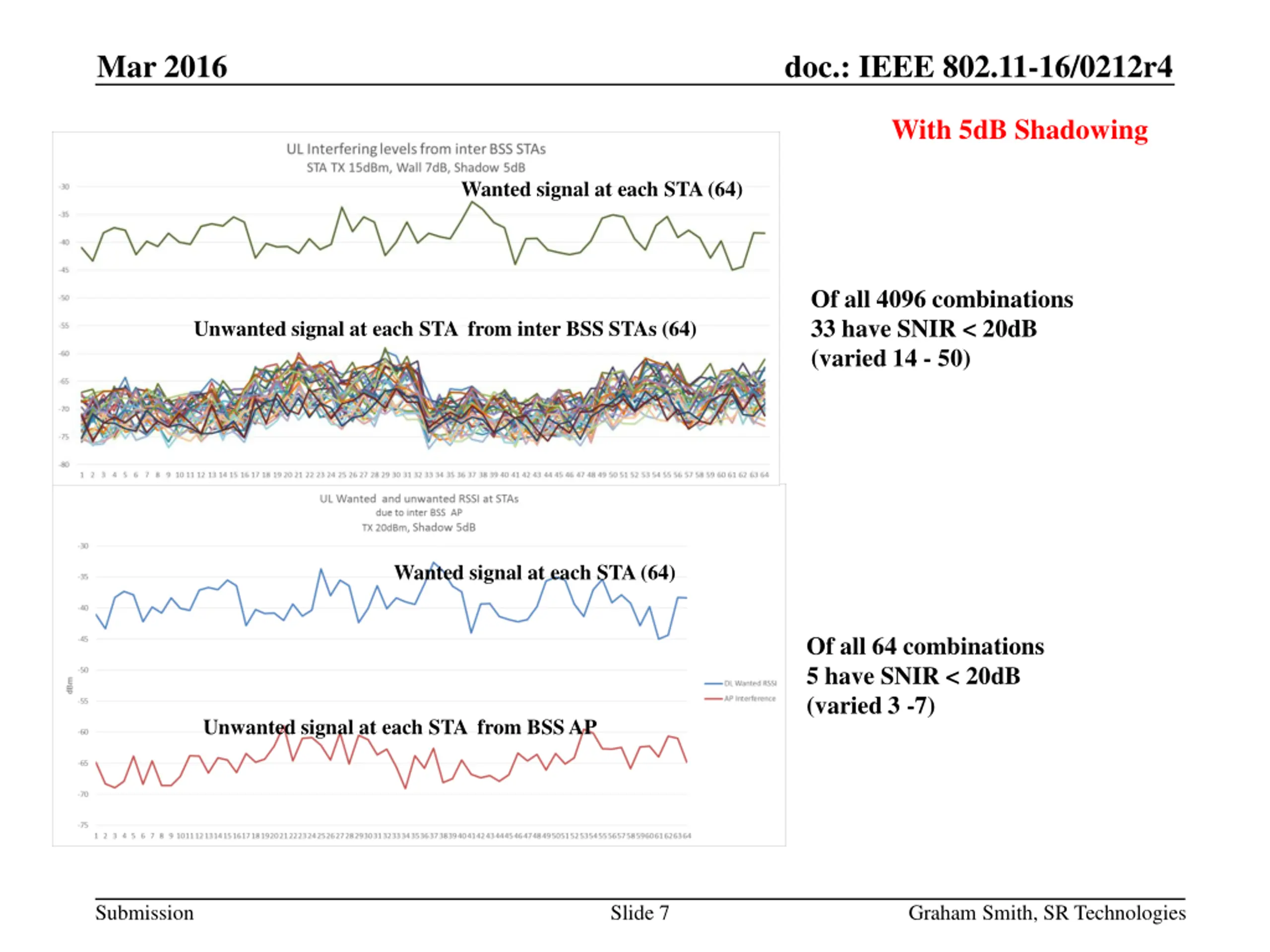 Mar 2016 doc.: IEEE 802.11-16/0212r4 No Shadowing Wanted signal at each STA (64) Of all 4096 combinations Only 6 have SNIR < 20dB Unwanted signal at each STA from inter BSS STAs (64) Note that difference between strongest to weakest UL wanted RSSI is only 8dB. Wanted signal at each STA (64) Of all 64 combinations Only 2 have SNIR < 20dB Unwanted signal at each STA from BSS AP Submission Slide 6 Graham Smith, SR Technologies