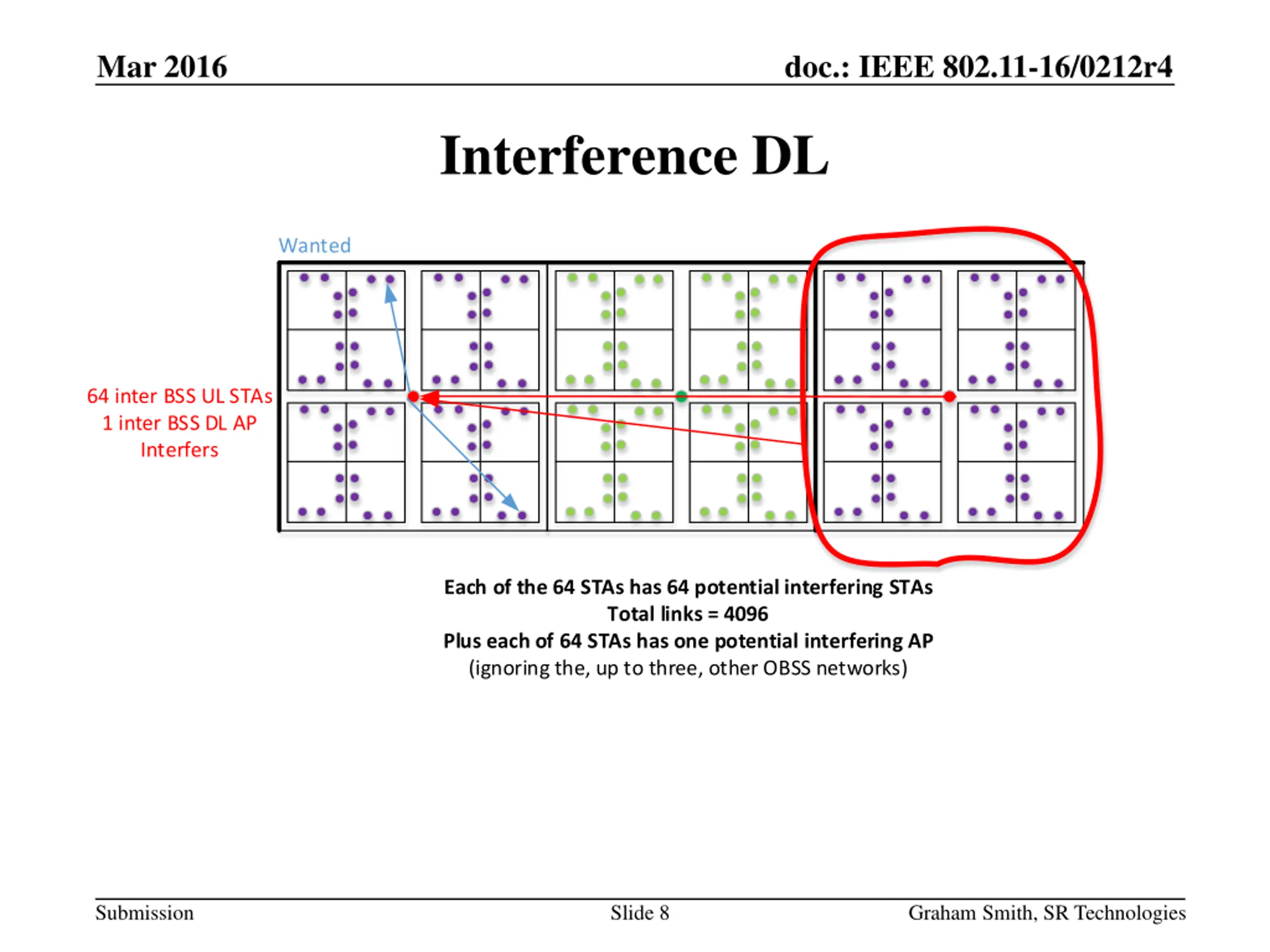 Mar 2016 doc.: IEEE 802.11-16/0212r4 With 5dB Shadowing Wanted signal at each STA (64) Of all 4096 combinations 33 have SNIR < 20dB (varied 14 - 50) Unwanted signal at each STA from inter BSS STAs (64) Wanted signal at each STA (64) Of all 64 combinations 5 have SNIR < 20dB (varied 3 -7) Unwanted signal at each STA from BSS AP Submission Slide 7 Graham Smith, SR Technologies