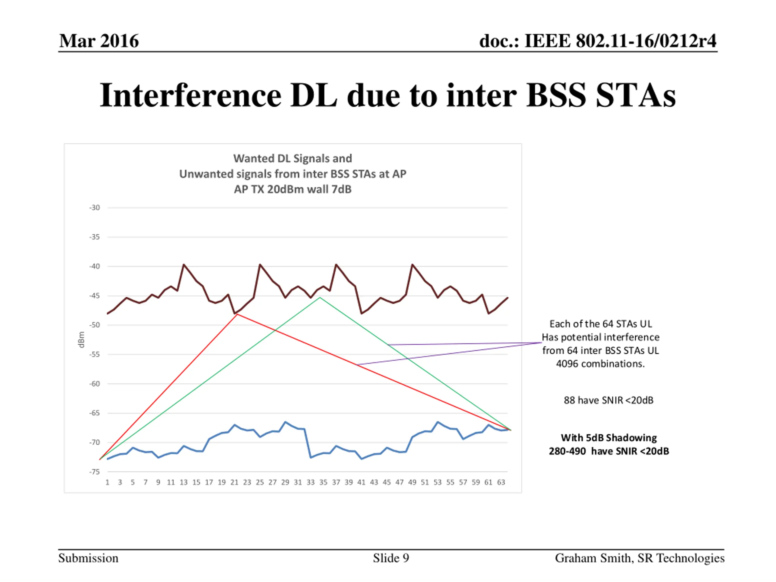 Mar 2016 doc.: IEEE 802.11-16/0212r4 Interference DL Wanted 64 inter BSS UL STAs 1 inter BSS DL AP Interfers Each of the 64 STAs has 64 potential interfering STAs Total links = 4096 Plus each of 64 STAs has one potential interfering AP (ignoring the, up to three, other OBSS networks) Submission Slide 8 Graham Smith, SR Technologies