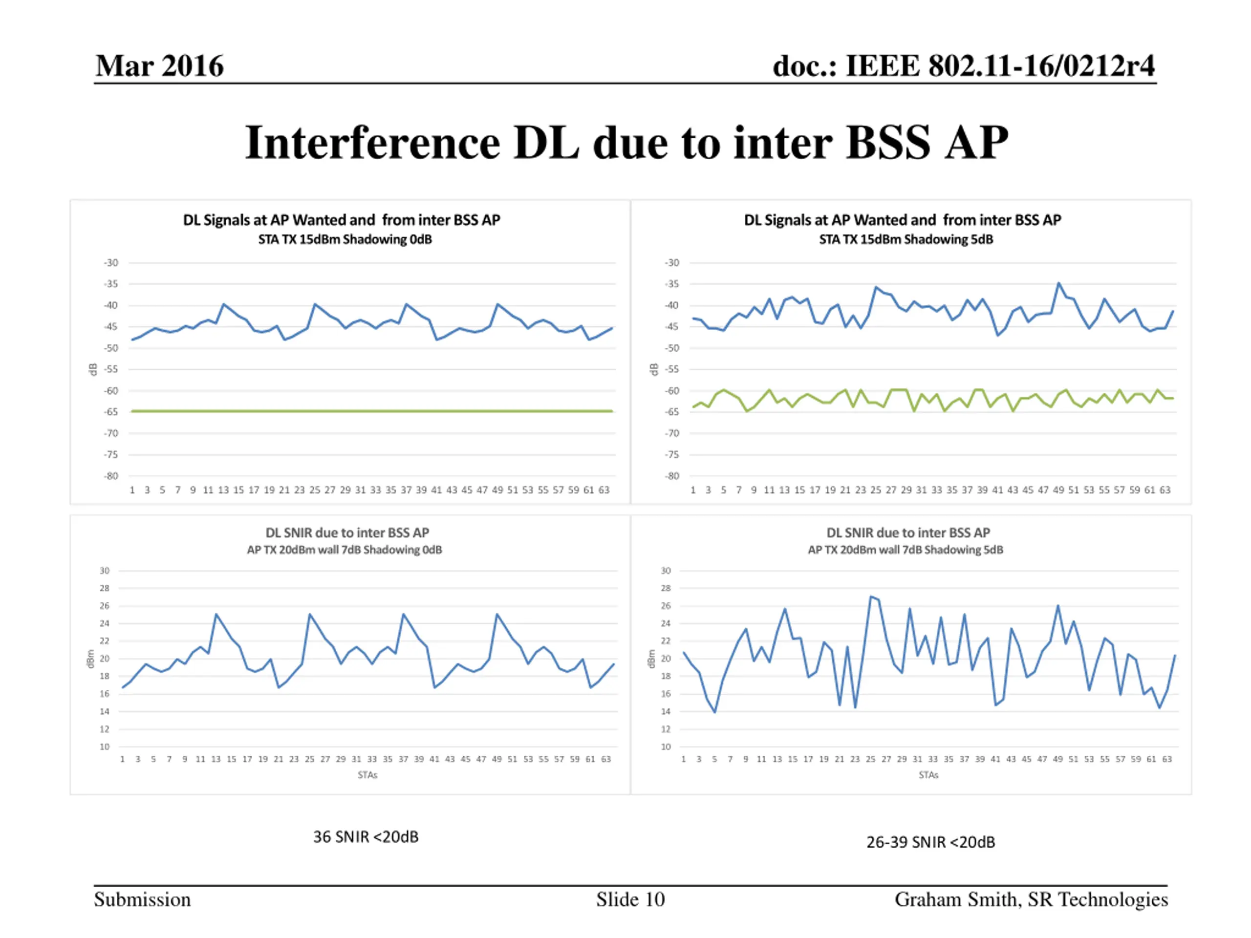 Mar 2016 doc.: IEEE 802.11-16/0212r4 Interference DL due to inter BSS STAs Wanted DL Signals and Unwanted signals from inter BSS STAs at AP AP TX 20dBm wall 7dB -30 -35 -40 -45 Each of the 64 STAs UL Has potential interference from 64 inter BSS STAs UL 4096 combinations. -50 dBm -55 -60 88 have SNIR <20dB -65 With 5dB Shadowing 280-490 have SNIR <20dB -70 -75 1 3 5 7 9 11 13 15 17 19 21 23 25 27 29 31 33 35 37 39 41 43 45 47 49 51 53 55 57 59 61 63 Submission Slide 9 Graham Smith, SR Technologies