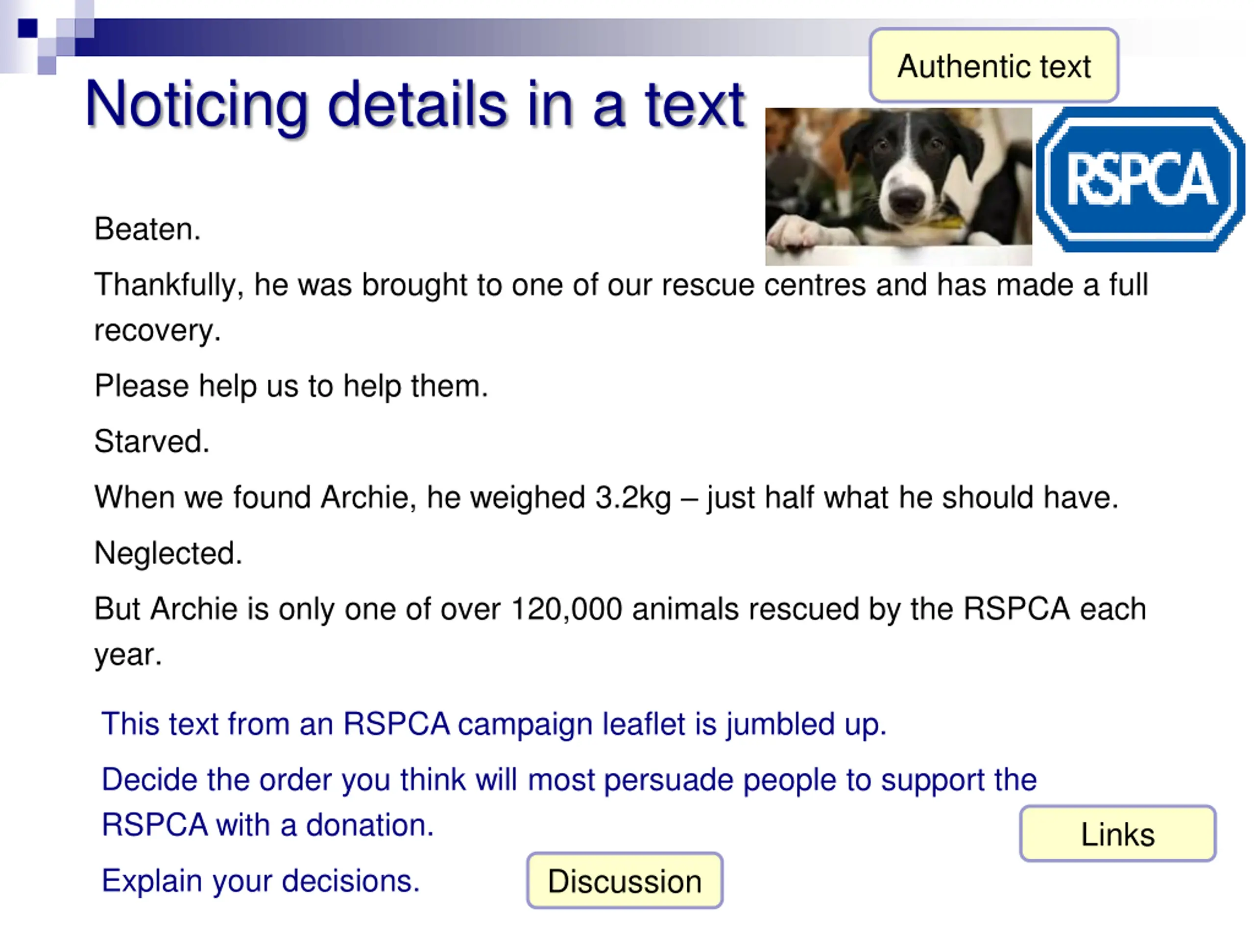 Authentic text Noticing details in a text Beaten. Thankfully, he was brought to one of our rescue centres and has made a full recovery. Please help us to help them. Starved. When we found Archie, he weighed 3.2kg just half what he should have. Neglected. But Archie is only one of over 120,000 animals rescued by the RSPCA each year. This text from an RSPCA campaign leaflet is jumbled up. Decide the order you think will most persuade people to support the RSPCA with a donation. Links Explain your decisions. Discussion