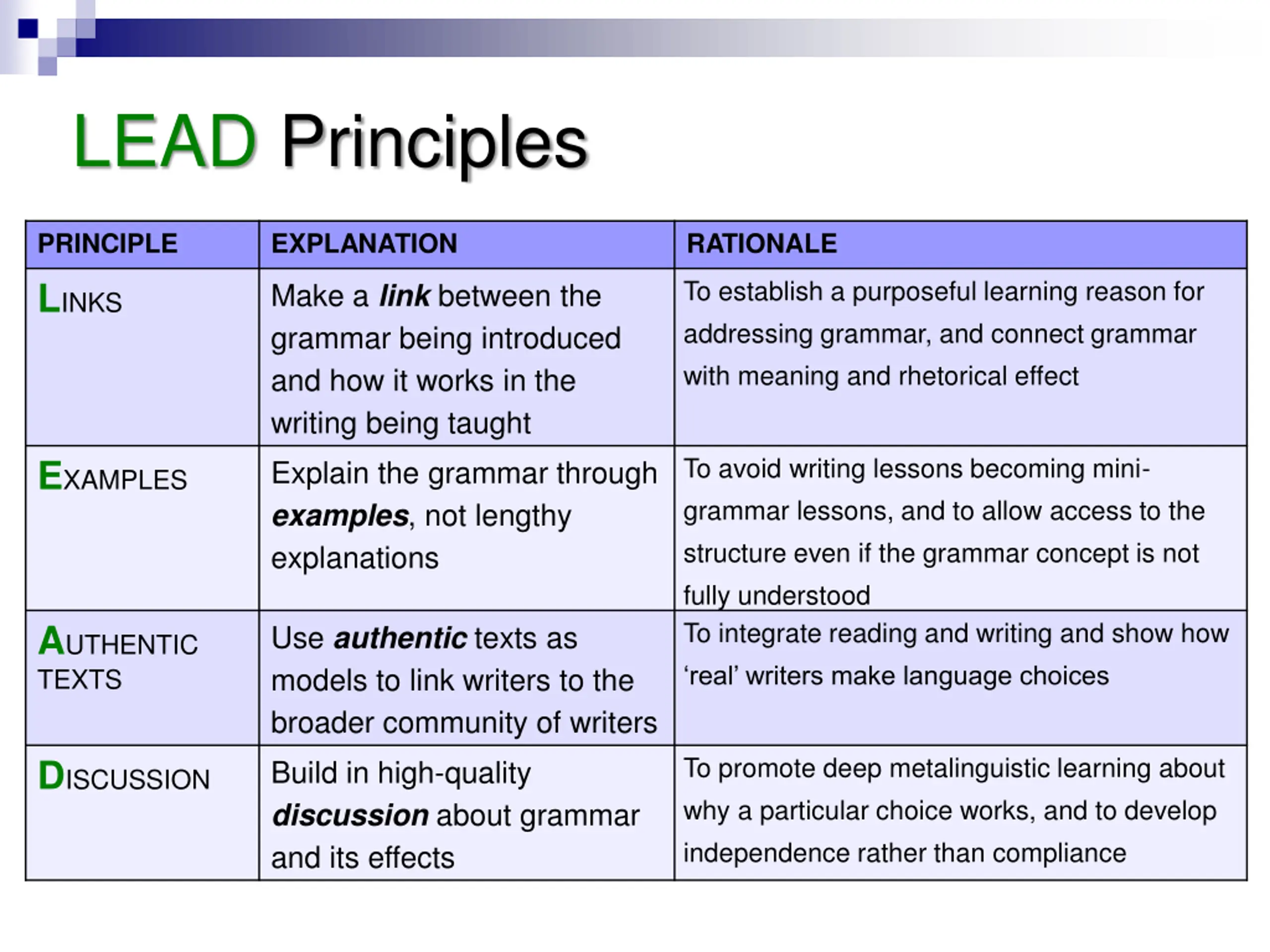 LEAD Principles PRINCIPLE LINKS EXPLANATION RATIONALE To establish a purposeful learning reason for addressing grammar, and connect grammar with meaning and rhetorical effect Make a link between the grammar being introduced and how it works in the writing being taught To avoid writing lessons becoming mini- grammar lessons, and to allow access to the structure even if the grammar concept is not fully understood To integrate reading and writing and show how real writers make language choices EXAMPLES Explain the grammar through examples, not lengthy explanations AUTHENTIC TEXTS Use authentic texts as models to link writers to the broader community of writers To promote deep metalinguistic learning about why a particular choice works, and to develop independence rather than compliance DISCUSSION Build in high-quality discussion about grammar and its effects
