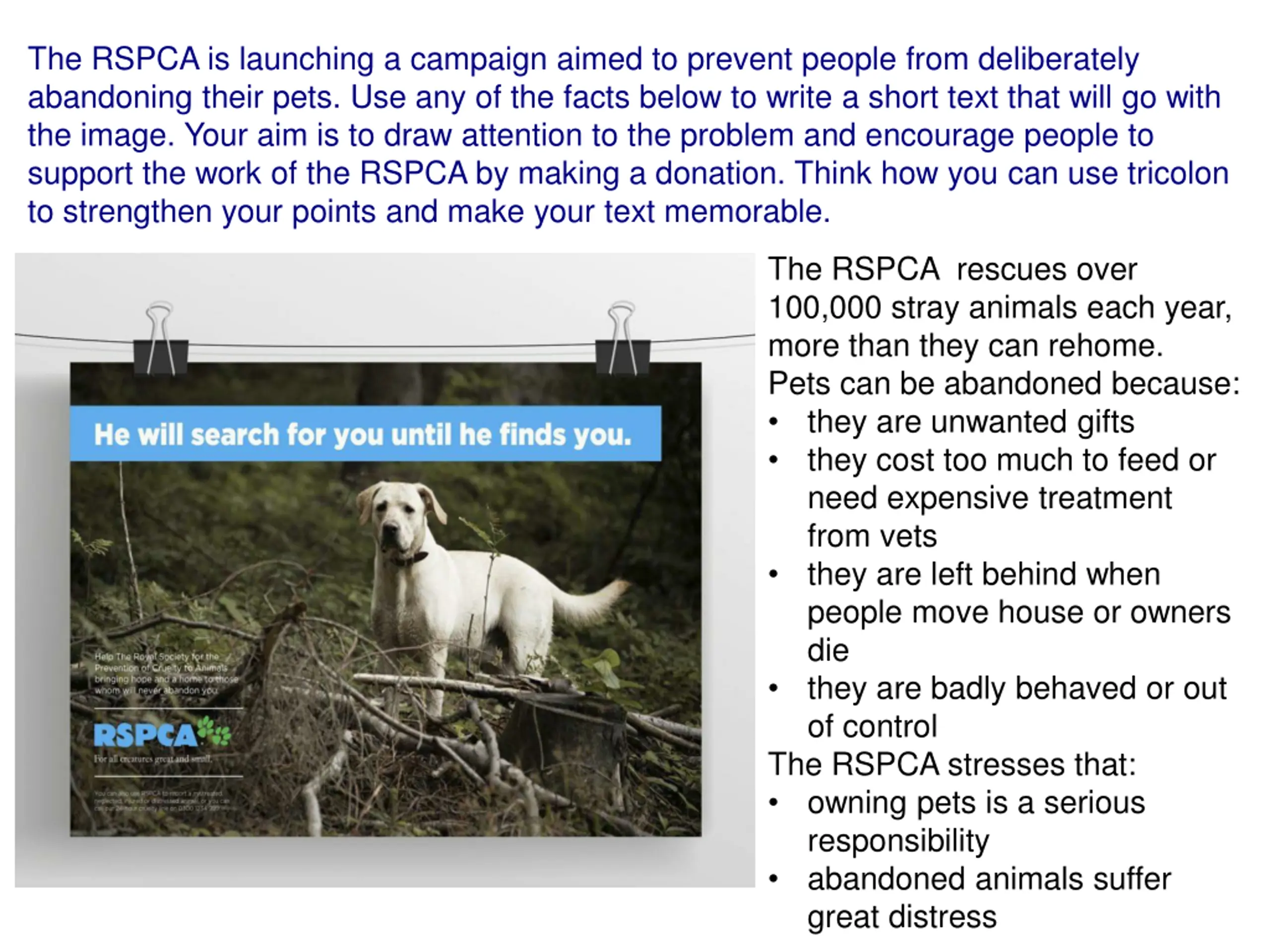 The RSPCA is launching a campaign aimed to prevent people from deliberately abandoning their pets. Use any of the facts below to write a short text that will go with the image. Your aim is to draw attention to the problem and encourage people to support the work of the RSPCA by making a donation. Think how you can use tricolon to strengthen your points and make your text memorable. The RSPCA rescues over 100,000 stray animals each year, more than they can rehome. Pets can be abandoned because: they are unwanted gifts they cost too much to feed or need expensive treatment from vets they are left behind when people move house or owners die they are badly behaved or out of control The RSPCA stresses that: owning pets is a serious responsibility abandoned animals suffer great distress