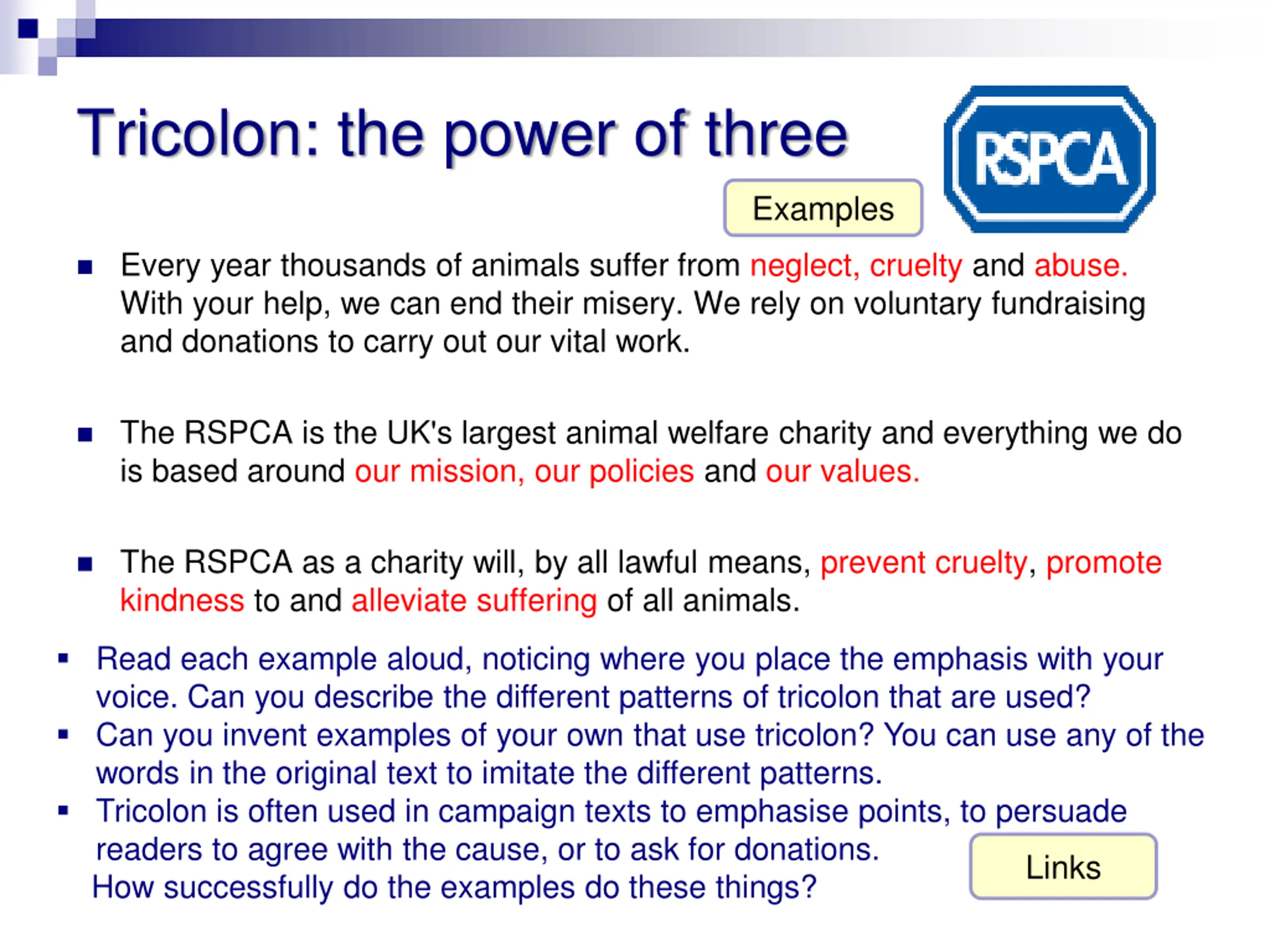 Tricolon: the power of three Examples Every year thousands of animals suffer from neglect, cruelty and abuse. With your help, we can end their misery. We rely on voluntary fundraising and donations to carry out our vital work. The RSPCA is the UK's largest animal welfare charity and everything we do is based around our mission, our policies and our values. The RSPCA as a charity will, by all lawful means, prevent cruelty, promote kindness to and alleviate suffering of all animals. Read each example aloud, noticing where you place the emphasis with your voice. Can you describe the different patterns of tricolon that are used? Can you invent examples of your own that use tricolon? You can use any of the words in the original text to imitate the different patterns. Tricolon is often used in campaign texts to emphasise points, to persuade readers to agree with the cause, or to ask for donations. How successfully do the examples do these things? Links
