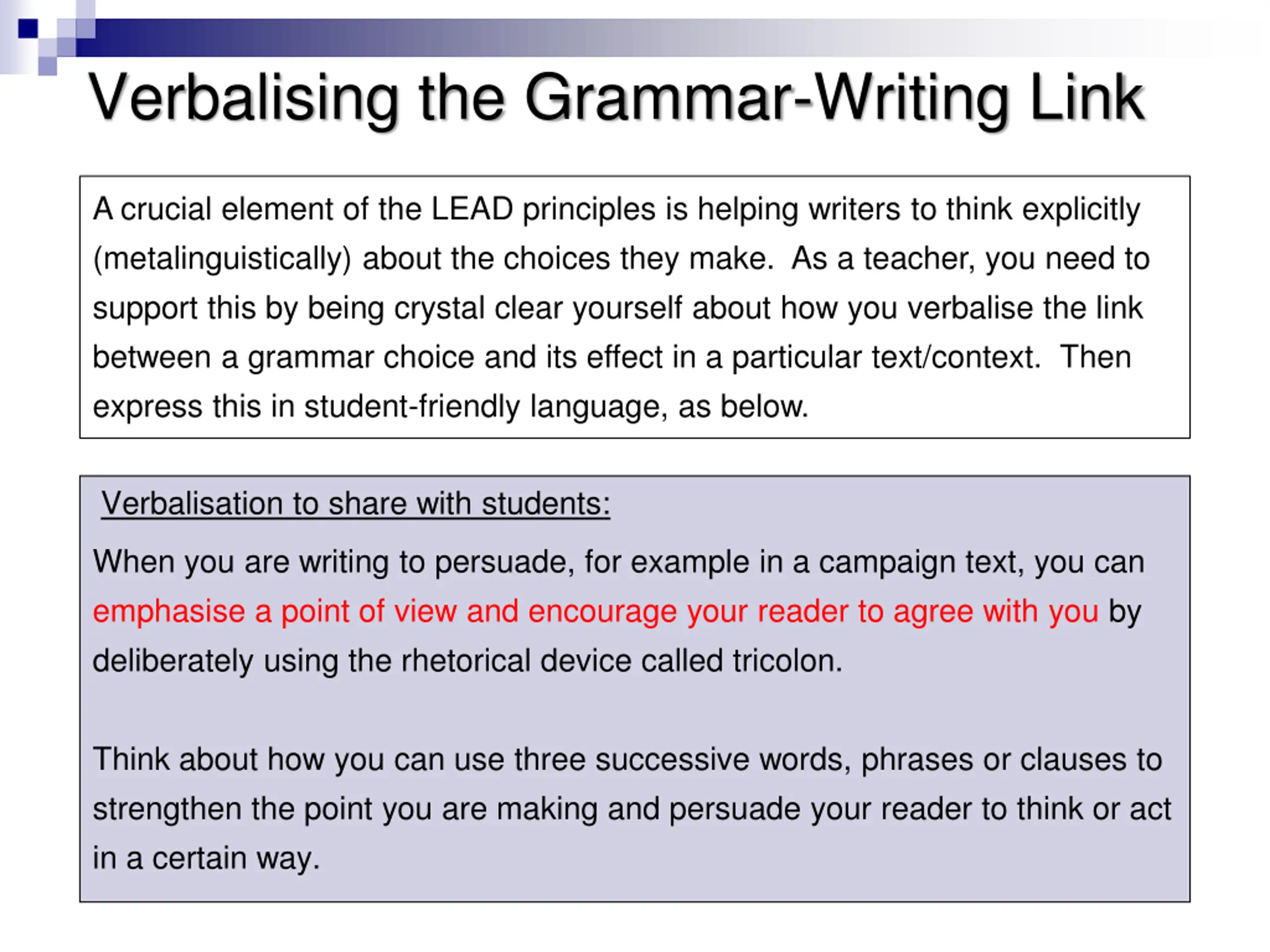 Verbalising the Grammar-Writing Link A crucial element of the LEAD principles is helping writers to think explicitly (metalinguistically) about the choices they make. As a teacher, you need to support this by being crystal clear yourself about how you verbalise the link between a grammar choice and its effect in a particular text/context. Then express this in student-friendly language, as below. Verbalisation to share with students: When you are writing to persuade, for example in a campaign text, you can emphasise a point of view and encourage your reader to agree with you by deliberately using the rhetorical device called tricolon. Think about how you can use three successive words, phrases or clauses to strengthen the point you are making and persuade your reader to think or act in a certain way.