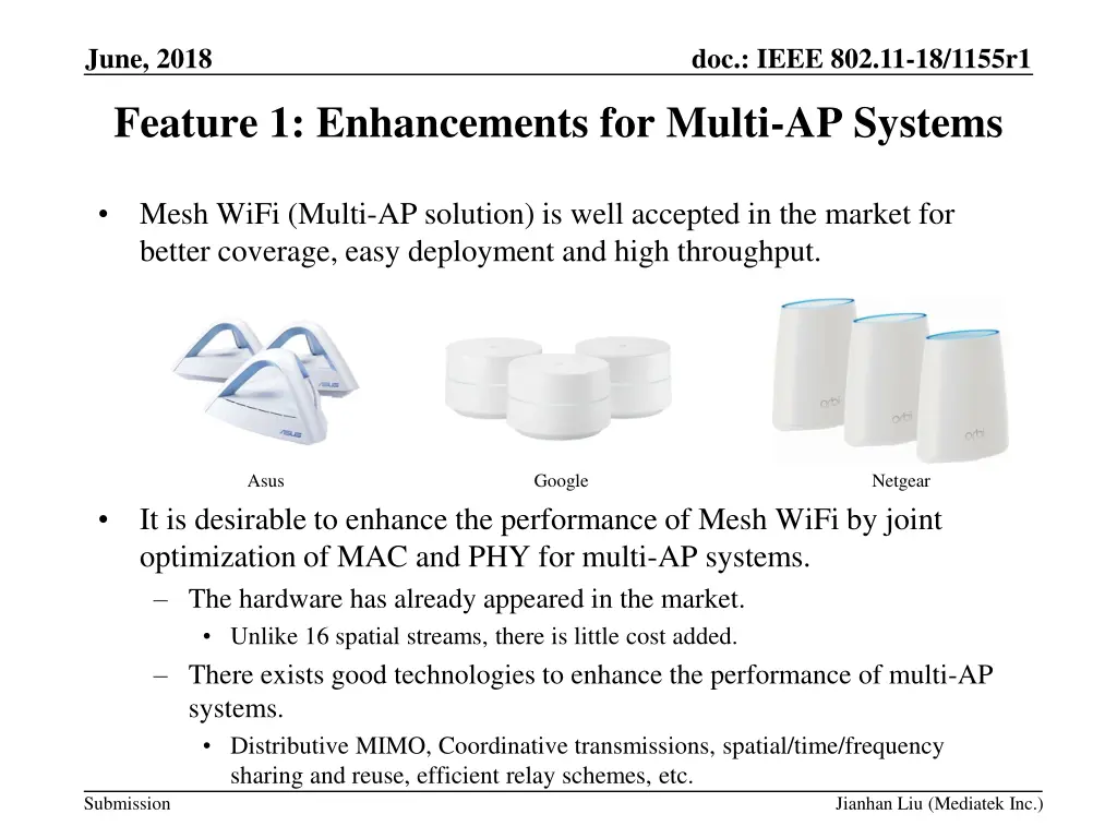 June, 2018 doc.: IEEE 802.11-18/1155r1 Feature 1: Enhancements for Multi-AP Systems Mesh WiFi (Multi-AP solution) is well accepted in the market for better coverage, easy deployment and high throughput. Asus Google Netgear It is desirable to enhance the performance of Mesh WiFi by joint optimization of MAC and PHY for multi-AP systems. The hardware has already appeared in the market. Unlike 16 spatial streams, there is little cost added. There exists good technologies to enhance the performance of multi-AP systems. Distributive MIMO, Coordinative transmissions, spatial/time/frequency sharing and reuse, efficient relay schemes, etc. Submission Jianhan Liu (Mediatek Inc.)