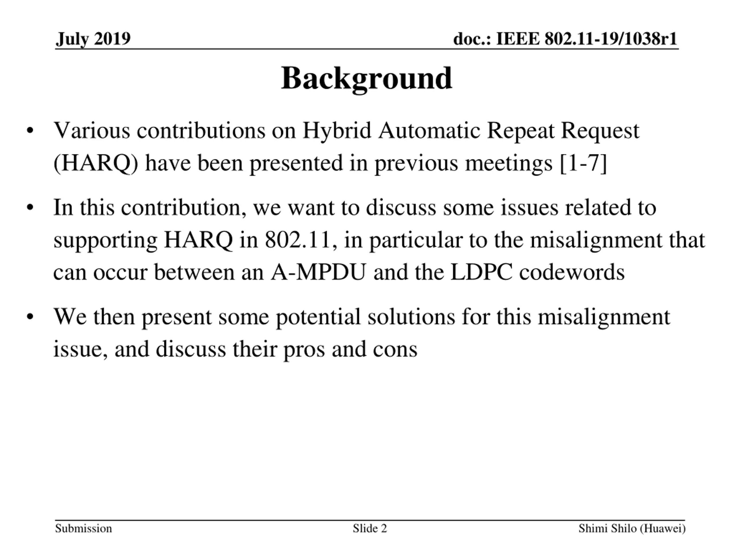July 2019 doc.: IEEE 802.11-19/1038r1 Background Various contributions on Hybrid Automatic Repeat Request (HARQ) have been presented in previous meetings [1-7] In this contribution, we want to discuss some issues related to supporting HARQ in 802.11, in particular to the misalignment that can occur between an A-MPDU and the LDPC codewords We then present some potential solutions for this misalignment issue, and discuss their pros and cons Submission Slide 2 Shimi Shilo (Huawei)
