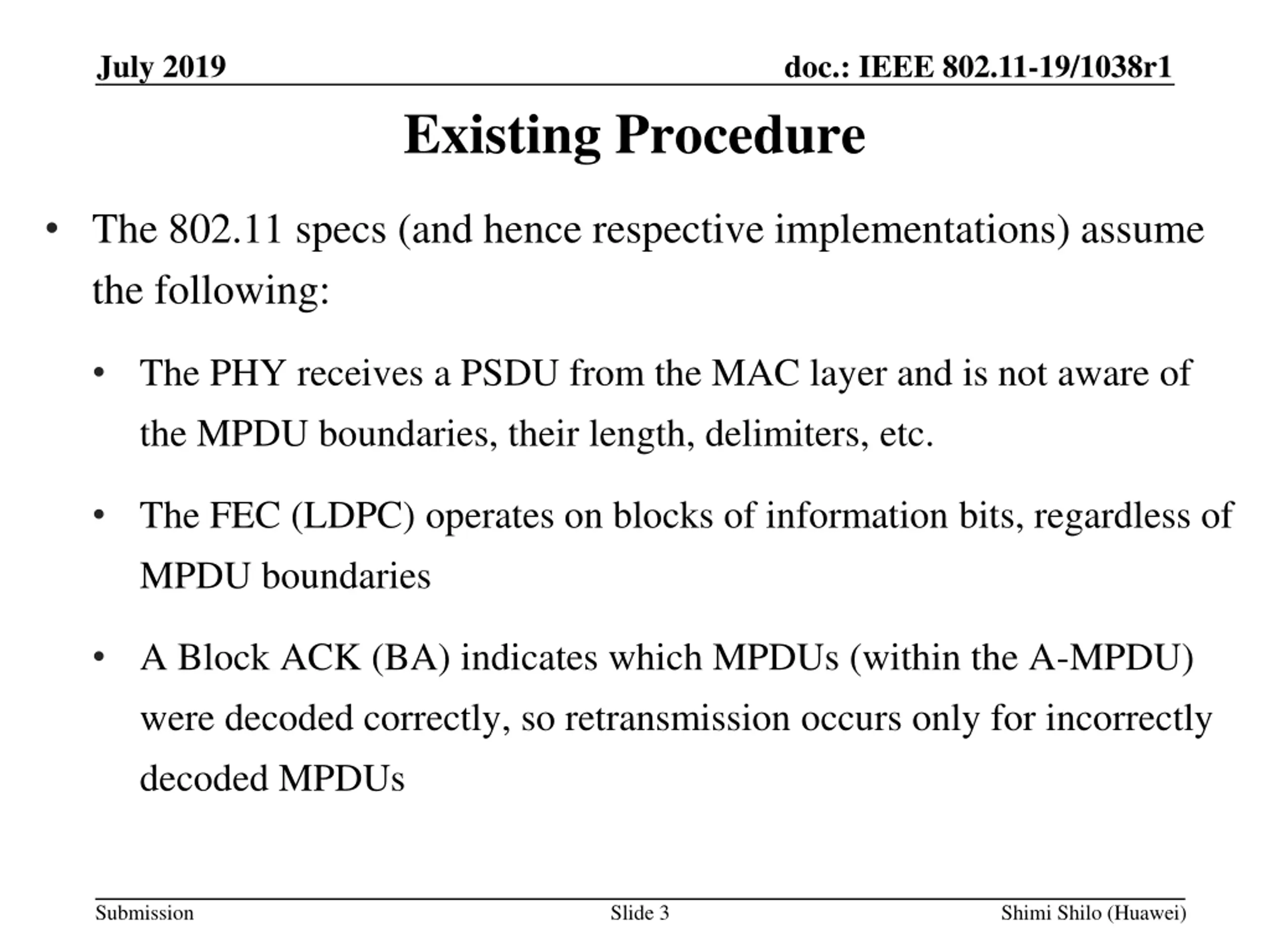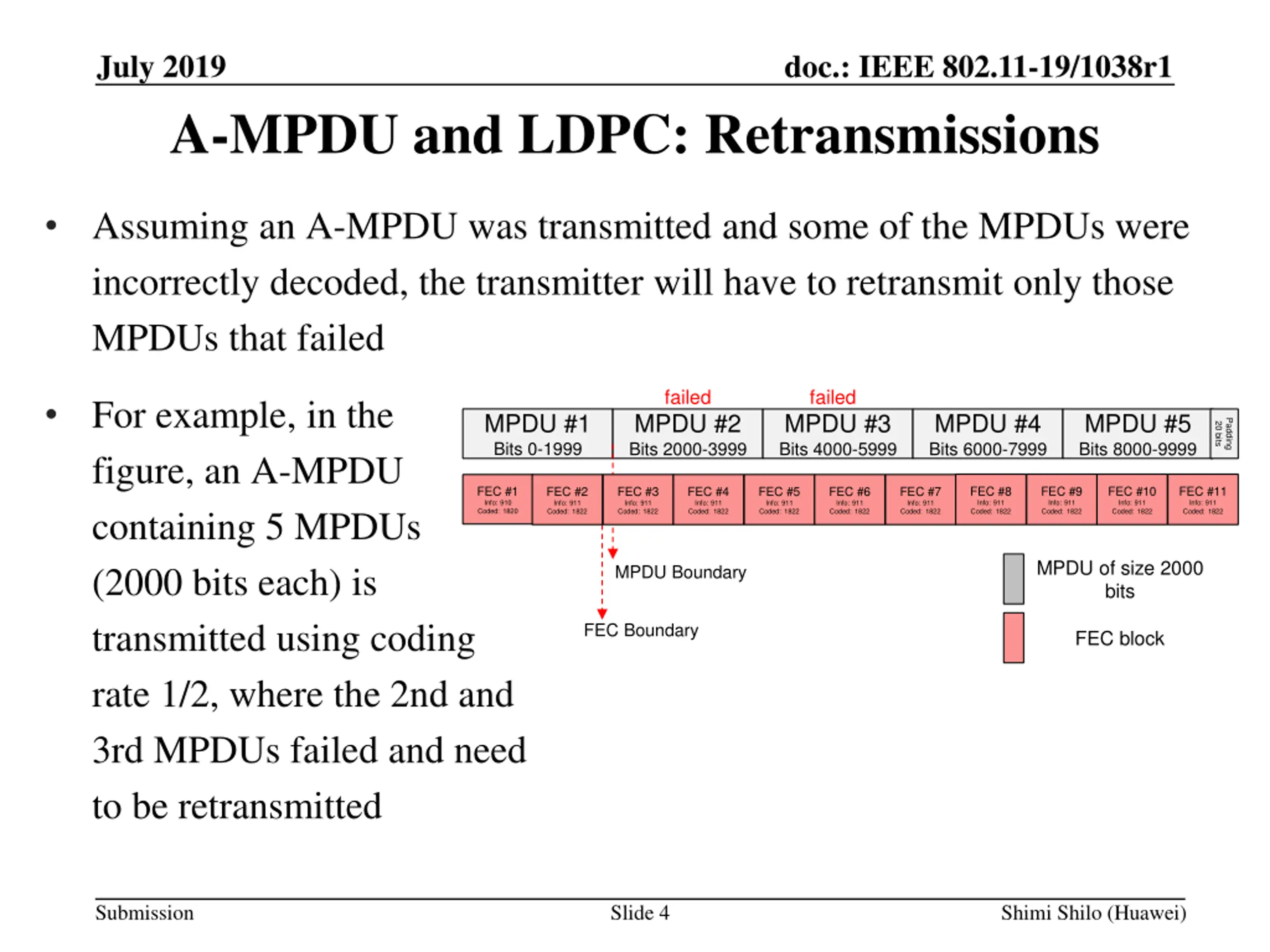 July 2019 doc.: IEEE 802.11-19/1038r1 Existing Procedure The 802.11 specs (and hence respective implementations) assume the following: The PHY receives a PSDU from the MAC layer and is not aware of the MPDU boundaries, their length, delimiters, etc. The FEC (LDPC) operates on blocks of information bits, regardless of MPDU boundaries A Block ACK (BA) indicates which MPDUs (within the A-MPDU) were decoded correctly, so retransmission occurs only for incorrectly decoded MPDUs Submission Slide 3 Shimi Shilo (Huawei)