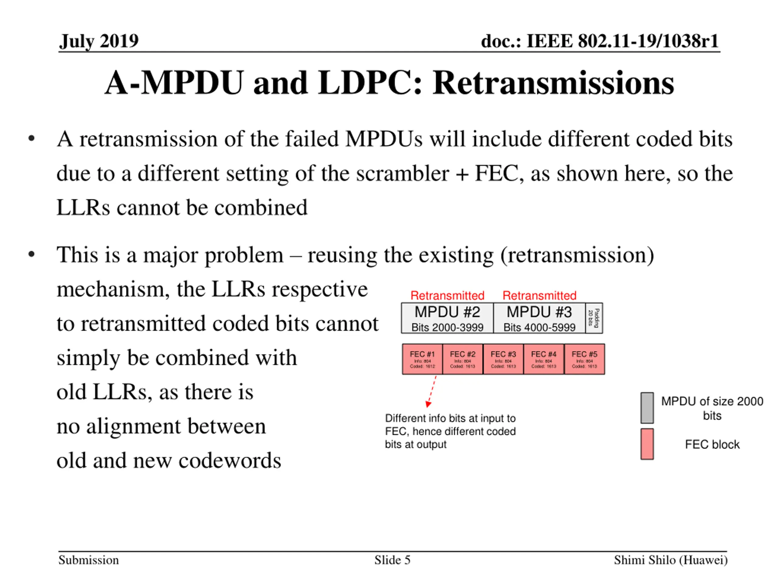 July 2019 doc.: IEEE 802.11-19/1038r1 A-MPDU and LDPC: Retransmissions Assuming an A-MPDU was transmitted and some of the MPDUs were incorrectly decoded, the transmitter will have to retransmit only those MPDUs that failed failed failed For example, in the figure, an A-MPDU containing 5 MPDUs (2000 bits each) is transmitted using coding rate 1/2, where the 2nd and 3rd MPDUs failed and need to be retransmitted MPDU #1 Bits 0-1999 MPDU #2 Bits 2000-3999 MPDU #3 Bits 4000-5999 MPDU #4 Bits 6000-7999 MPDU #5 Bits 8000-9999 Padding 20 bits FEC #1 Info: 910 Coded: 1820 FEC #8 Info: 911 Coded: 1822 FEC #9 Info: 911 Coded: 1822 FEC #10 Info: 911 Coded: 1822 FEC #11 Info: 911 Coded: 1822 FEC #2 Info: 911 Coded: 1822 FEC #3 Info: 911 Coded: 1822 FEC #4 Info: 911 Coded: 1822 FEC #5 Info: 911 Coded: 1822 FEC #6 Info: 911 Coded: 1822 FEC #7 Info: 911 Coded: 1822 MPDU of size 2000 bits MPDU Boundary FEC Boundary FEC block Submission Slide 4 Shimi Shilo (Huawei)
