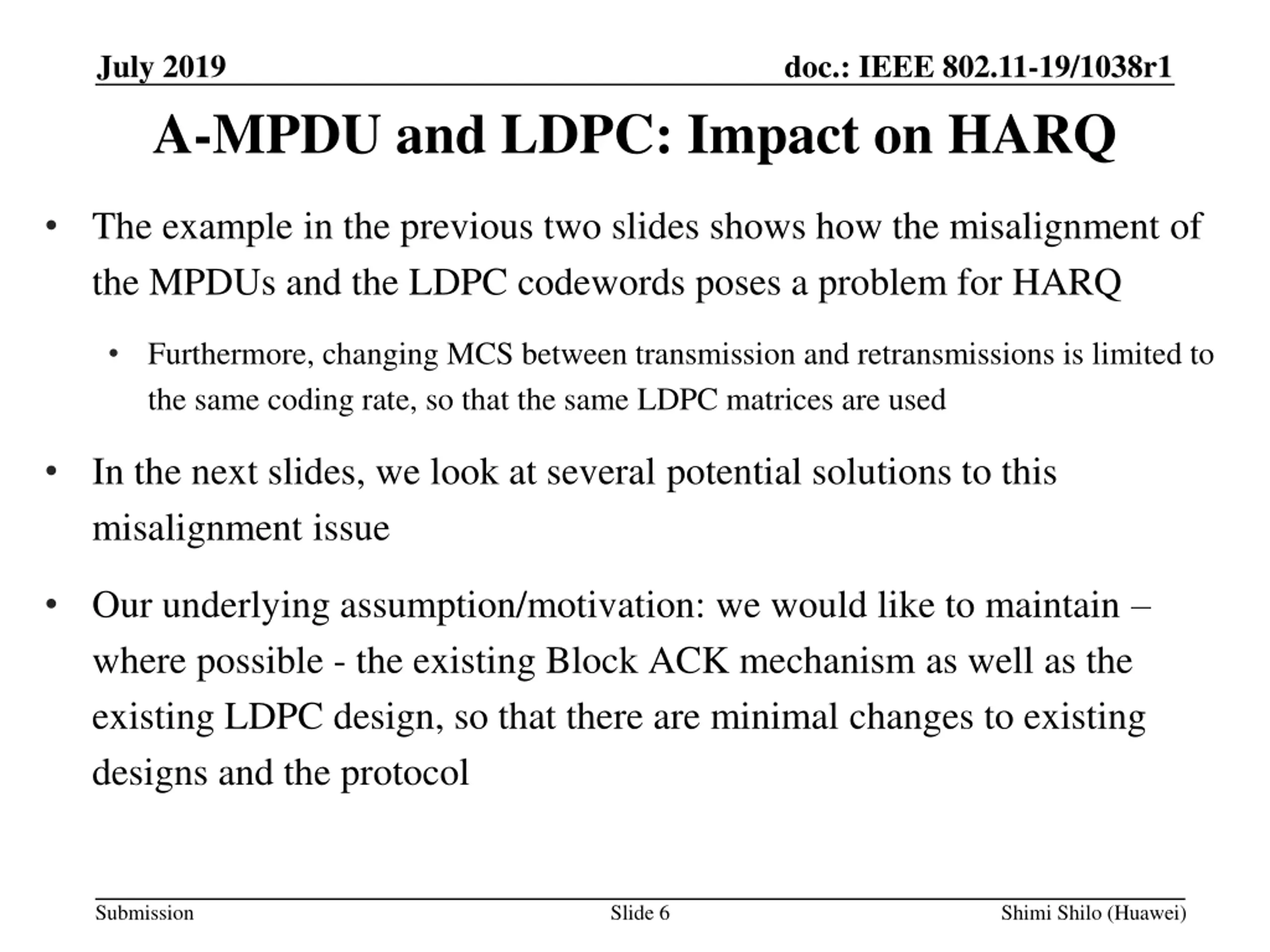 July 2019 doc.: IEEE 802.11-19/1038r1 A-MPDU and LDPC: Impact on HARQ The example in the previous two slides shows how the misalignment of the MPDUs and the LDPC codewords poses a problem for HARQ Furthermore, changing MCS between transmission and retransmissions is limited to the same coding rate, so that the same LDPC matrices are used In the next slides, we look at several potential solutions to this misalignment issue Our underlying assumption/motivation: we would like to maintain where possible - the existing Block ACK mechanism as well as the existing LDPC design, so that there are minimal changes to existing designs and the protocol Submission Slide 6 Shimi Shilo (Huawei)
