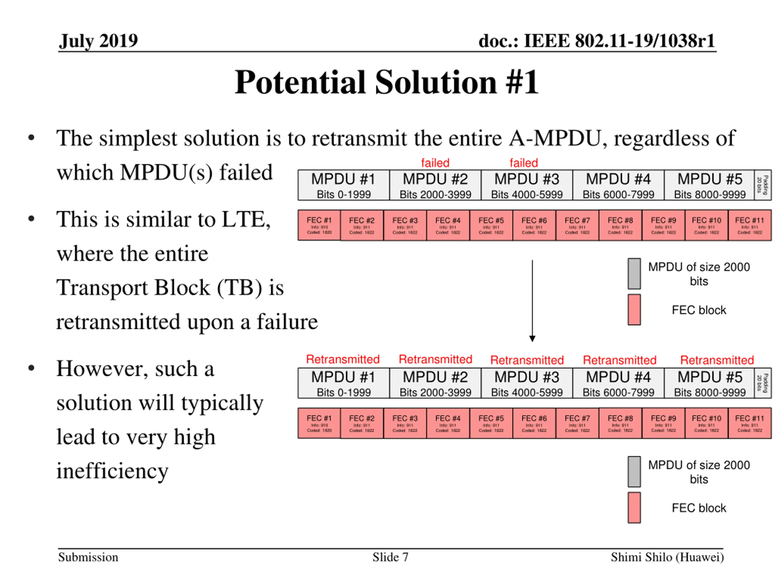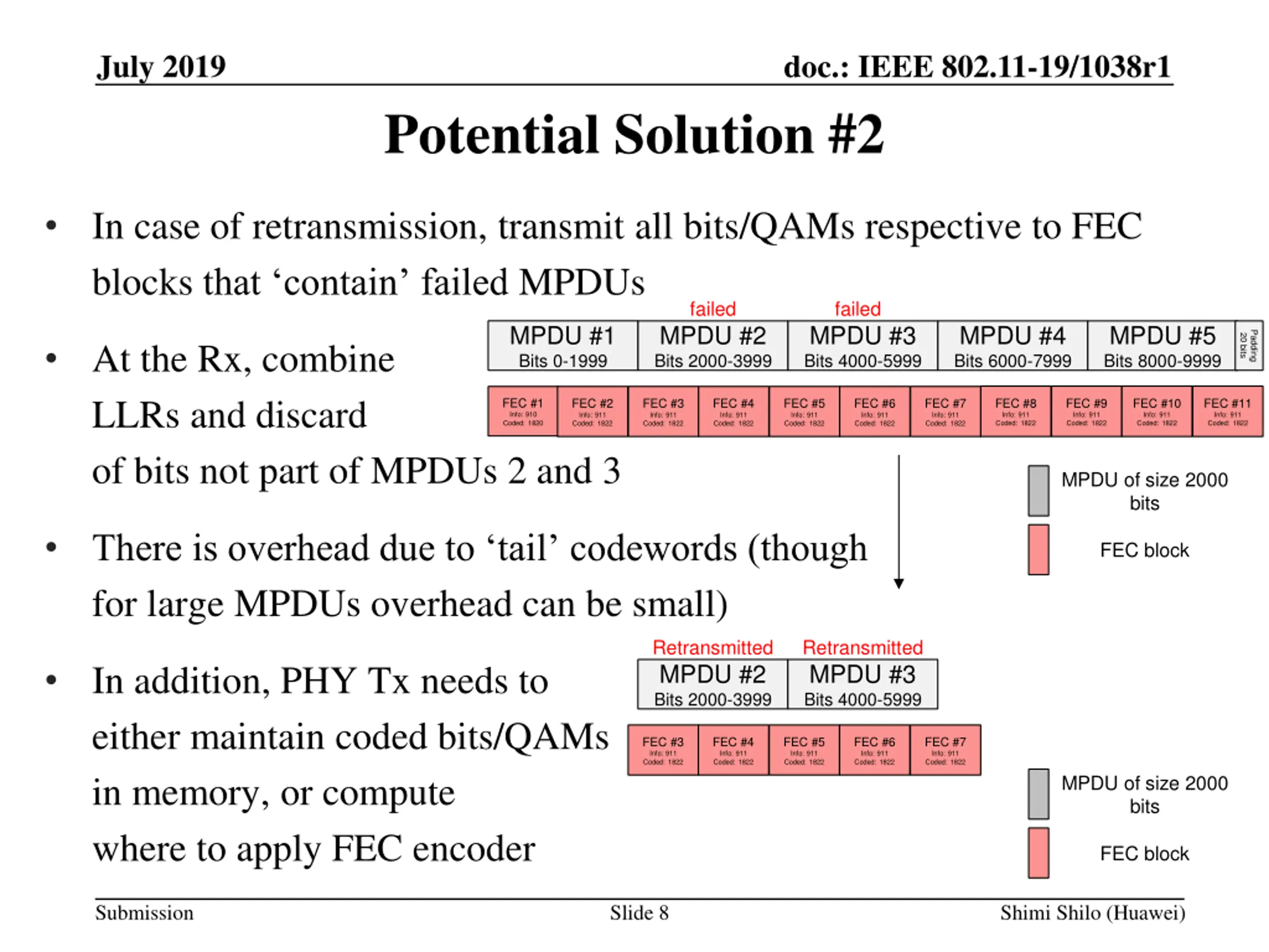 July 2019 doc.: IEEE 802.11-19/1038r1 Potential Solution #1 The simplest solution is to retransmit the entire A-MPDU, regardless of which MPDU(s) failed MPDU #1 Bits 0-1999 failed failed MPDU #2 Bits 2000-3999 MPDU #3 Bits 4000-5999 MPDU #4 Bits 6000-7999 MPDU #5 Bits 8000-9999 Padding 20 bits This is similar to LTE, where the entire Transport Block (TB) is retransmitted upon a failure FEC #1 Info: 910 Coded: 1820 FEC #8 Info: 911 Coded: 1822 FEC #9 Info: 911 Coded: 1822 FEC #10 Info: 911 Coded: 1822 FEC #11 Info: 911 Coded: 1822 FEC #2 Info: 911 Coded: 1822 FEC #3 Info: 911 Coded: 1822 FEC #4 Info: 911 Coded: 1822 FEC #5 Info: 911 Coded: 1822 FEC #6 Info: 911 Coded: 1822 FEC #7 Info: 911 Coded: 1822 MPDU of size 2000 bits FEC block Retransmitted Retransmitted Retransmitted Retransmitted Retransmitted However, such a solution will typically lead to very high inefficiency MPDU #1 Bits 0-1999 MPDU #2 Bits 2000-3999 MPDU #3 Bits 4000-5999 MPDU #4 Bits 6000-7999 MPDU #5 Bits 8000-9999 Padding 20 bits FEC #1 Info: 910 Coded: 1820 FEC #8 Info: 911 Coded: 1822 FEC #9 Info: 911 Coded: 1822 FEC #10 Info: 911 Coded: 1822 FEC #11 Info: 911 Coded: 1822 FEC #2 Info: 911 Coded: 1822 FEC #3 Info: 911 Coded: 1822 FEC #4 Info: 911 Coded: 1822 FEC #5 Info: 911 Coded: 1822 FEC #6 Info: 911 Coded: 1822 FEC #7 Info: 911 Coded: 1822 MPDU of size 2000 bits FEC block Submission Slide 7 Shimi Shilo (Huawei)