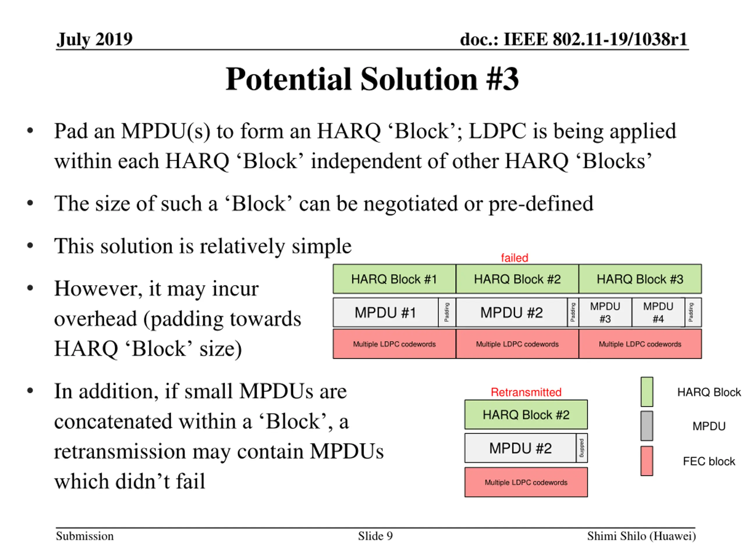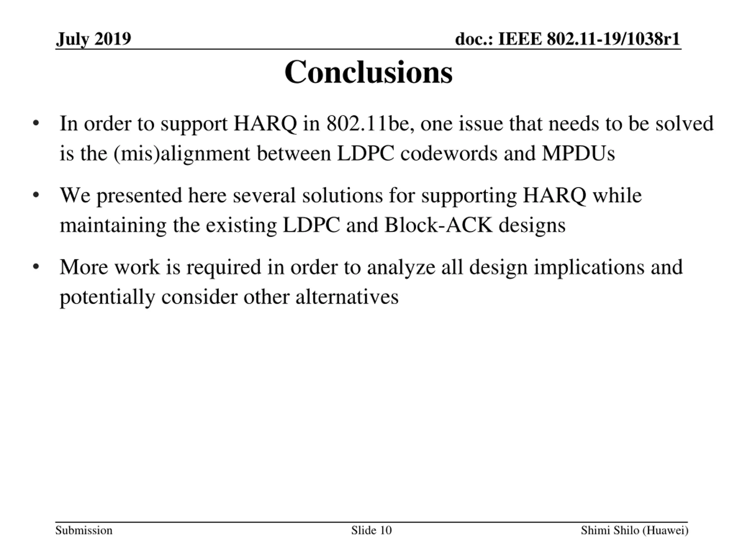 July 2019 doc.: IEEE 802.11-19/1038r1 Potential Solution #3 Pad an MPDU(s) to form an HARQ Block ; LDPC is being applied within each HARQ Block independent of other HARQ Blocks The size of such a Block can be negotiated or pre-defined This solution is relatively simple failed HARQ Block #1 HARQ Block #2 HARQ Block #3 However, it may incur overhead (padding towards HARQ Block size) MPDU #3 MPDU #4 Padding Padding Padding MPDU #1 MPDU #2 Multiple LDPC codewords Multiple LDPC codewords Multiple LDPC codewords In addition, if small MPDUs are concatenated within a Block , a retransmission may contain MPDUs which didn t fail Retransmitted HARQ Block HARQ Block #2 MPDU padding MPDU #2 FEC block Multiple LDPC codewords Submission Slide 9 Shimi Shilo (Huawei)
