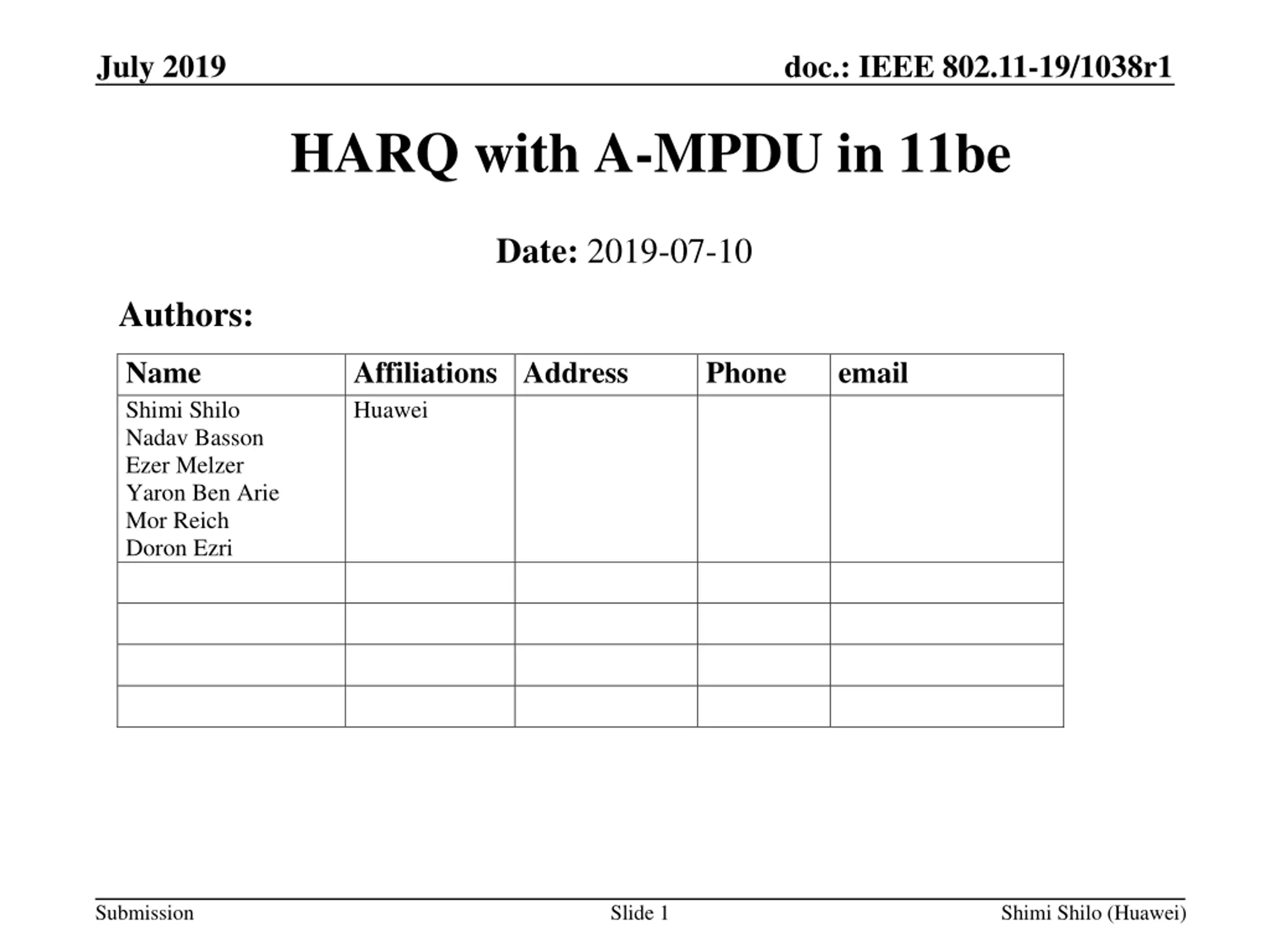 July 2019 doc.: IEEE 802.11-19/1038r1 HARQ with A-MPDU in 11be Date: 2019-07-10 Authors: Name Shimi Shilo Nadav Basson Ezer Melzer Yaron Ben Arie Mor Reich Doron Ezri Affiliations Address Huawei Phone email Submission Slide 1 Shimi Shilo (Huawei)