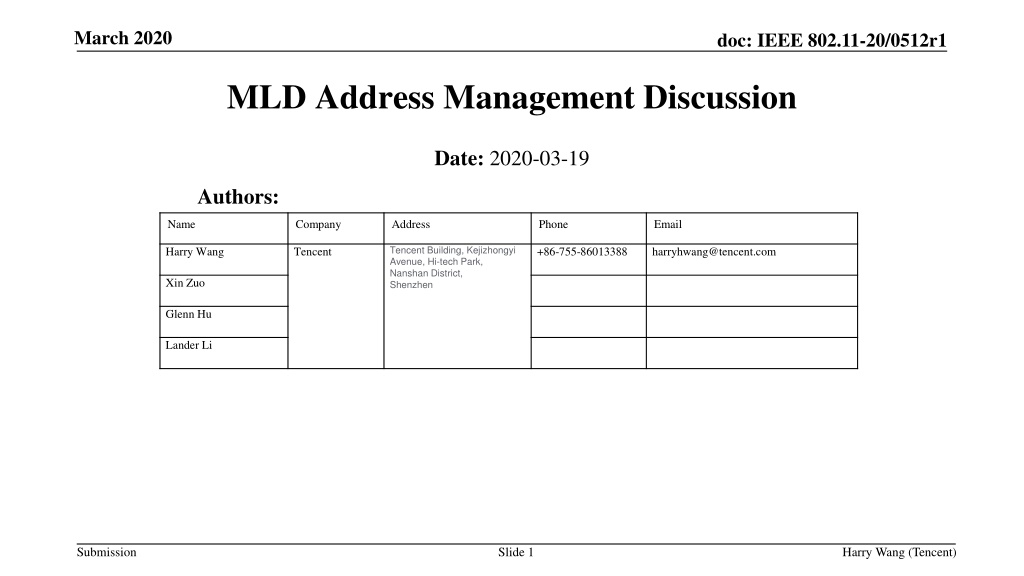 March 2020 doc: IEEE 802.11-20/0512r1 MLD Address Management Discussion Date: 2020-03-19 Authors: Name Company Address Phone Email Tencent Building, Kejizhongyi Avenue, Hi-tech Park, Nanshan District, Shenzhen Harry Wang Tencent +86-755-86013388 harryhwang@tencent.com Xin Zuo Glenn Hu Lander Li Submission Slide 1 Harry Wang (Tencent)