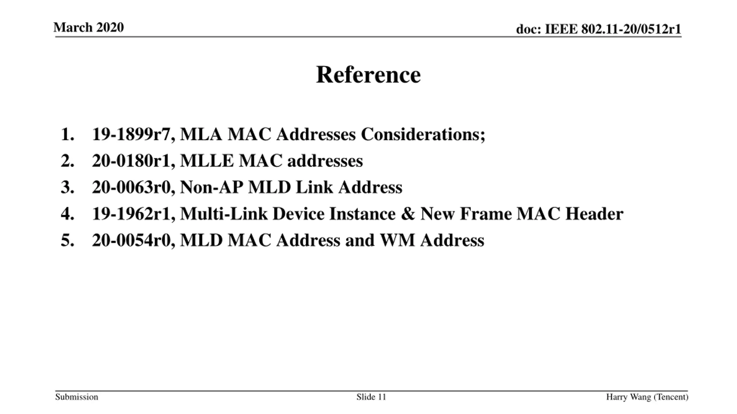 March 2020 doc: IEEE 802.11-20/0512r1 Reference 1. 2. 3. 4. 5. 19-1899r7, MLA MAC Addresses Considerations; 20-0180r1, MLLE MAC addresses 20-0063r0, Non-AP MLD Link Address 19-1962r1, Multi-Link Device Instance & New Frame MAC Header 20-0054r0, MLD MAC Address and WM Address Submission Slide 11 Harry Wang (Tencent)