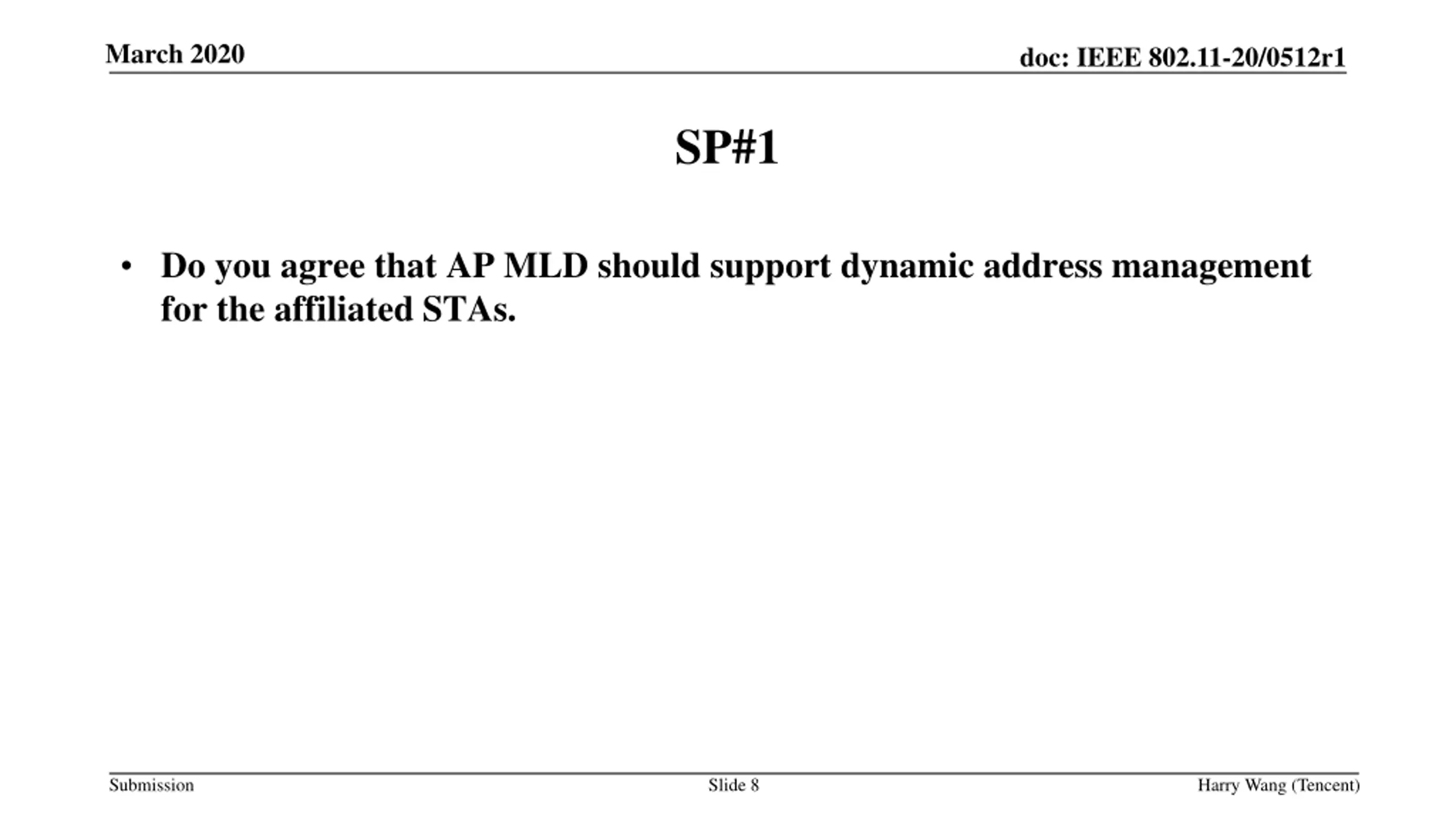 March 2020 doc: IEEE 802.11-20/0512r1 SP#1 Do you agree that AP MLD should support dynamic address management for the affiliated STAs. Submission Slide 8 Harry Wang (Tencent)