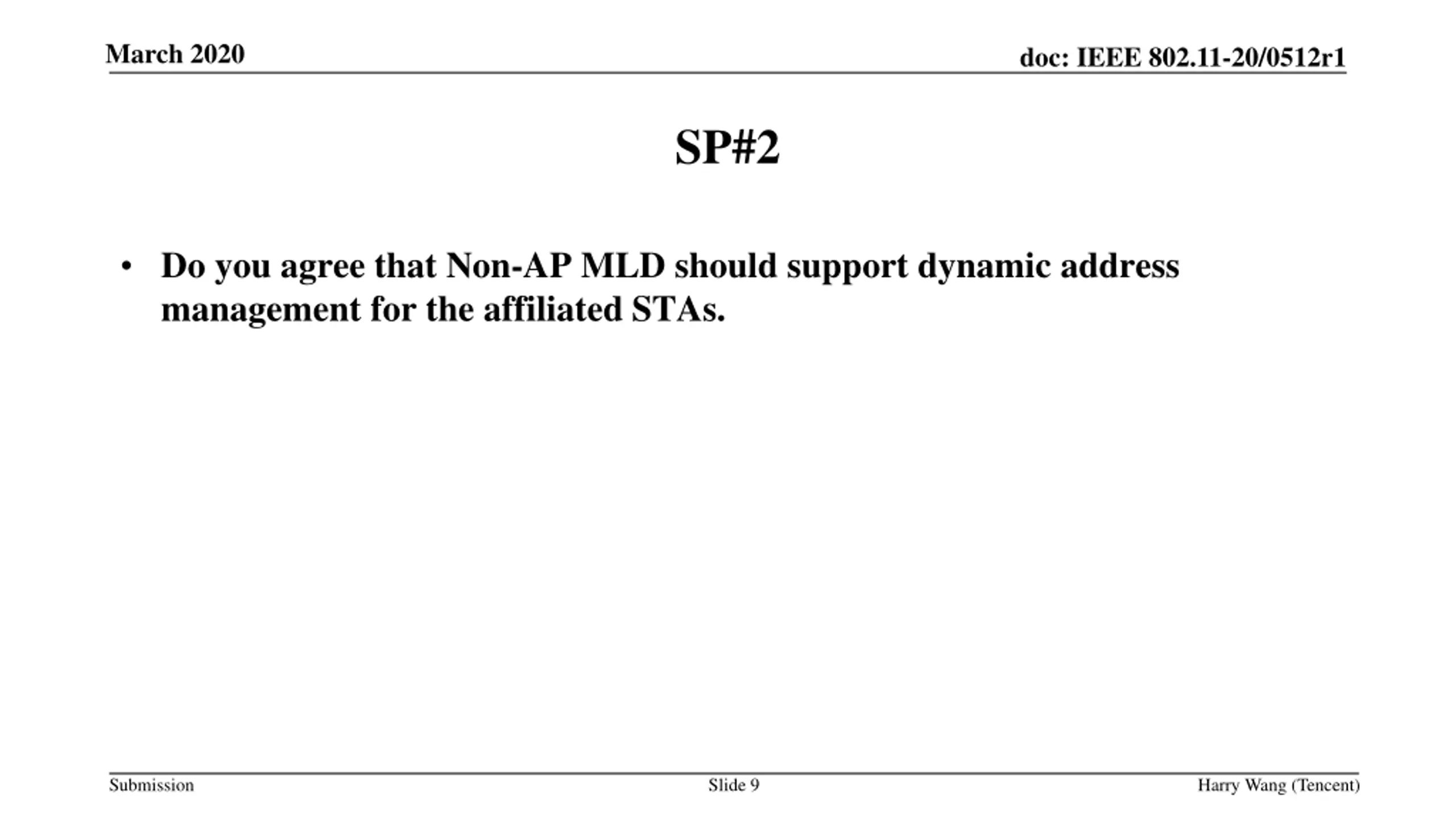 March 2020 doc: IEEE 802.11-20/0512r1 SP#2 Do you agree that Non-AP MLD should support dynamic address management for the affiliated STAs. Submission Slide 9 Harry Wang (Tencent)