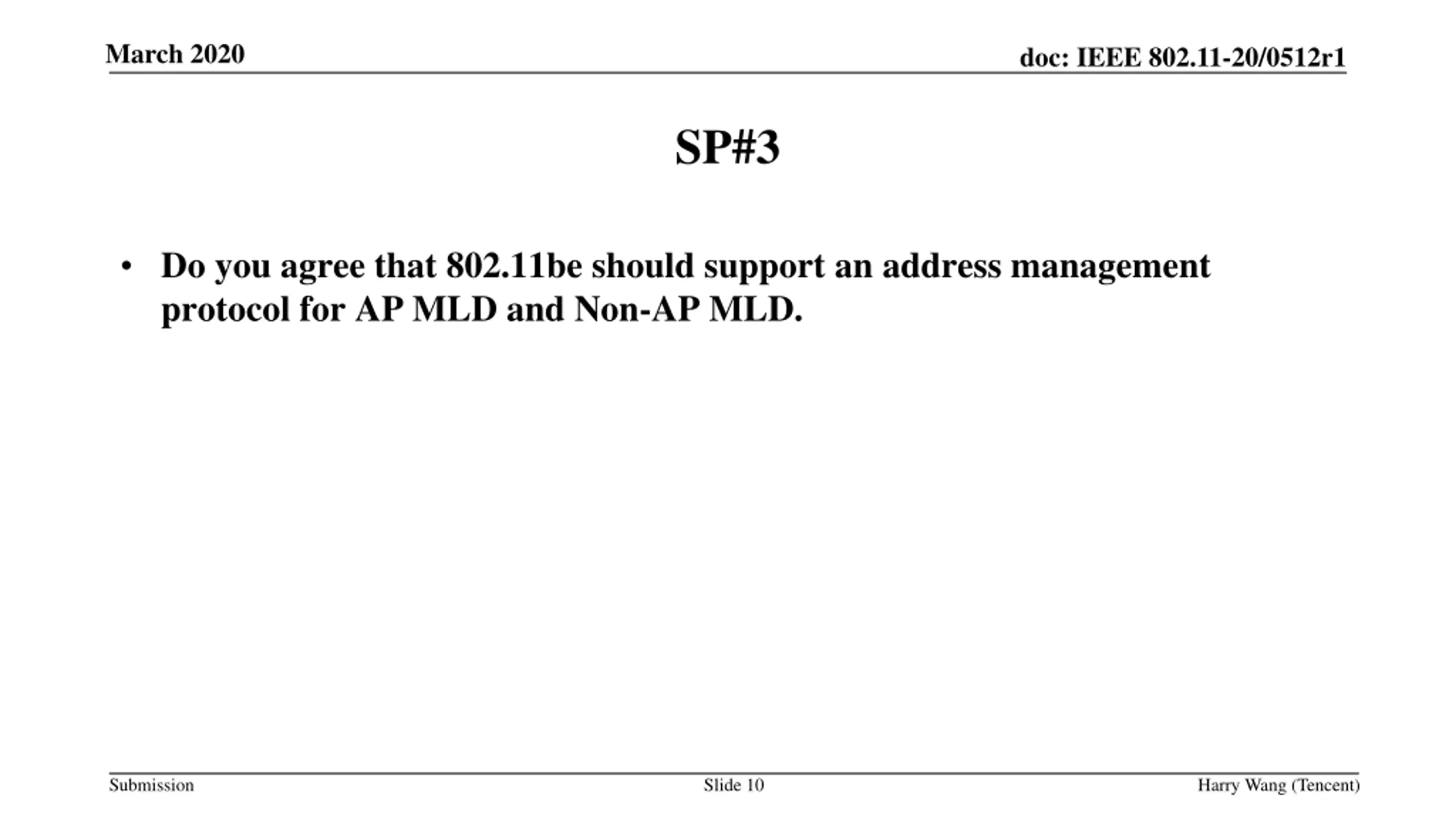 March 2020 doc: IEEE 802.11-20/0512r1 SP#3 Do you agree that 802.11be should support an address management protocol for AP MLD and Non-AP MLD. Submission Slide 10 Harry Wang (Tencent)