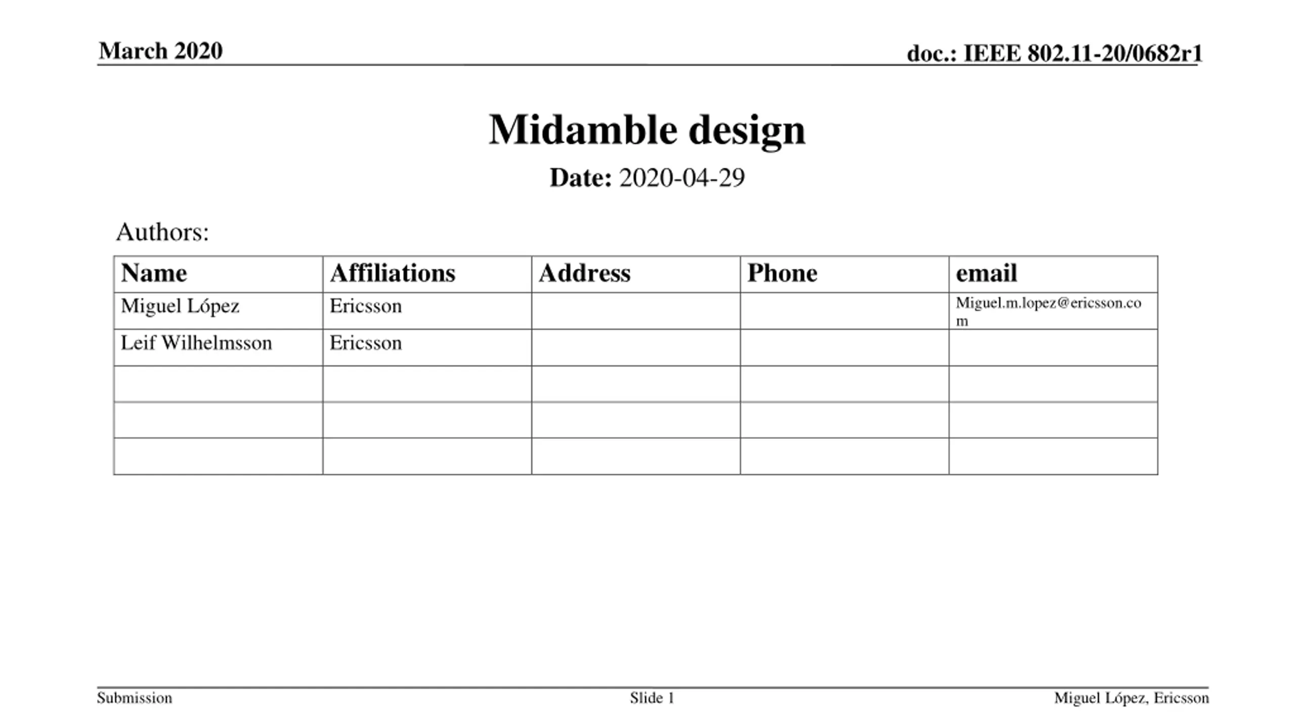 March 2020 doc.: IEEE 802.11-20/0682r1 Midamble design Date: 2020-04-29 Authors: Name Miguel L pez Affiliations Ericsson Address Phone email Miguel.m.lopez@ericsson.co m Leif Wilhelmsson Ericsson Submission Slide 1 Miguel L pez, Ericsson