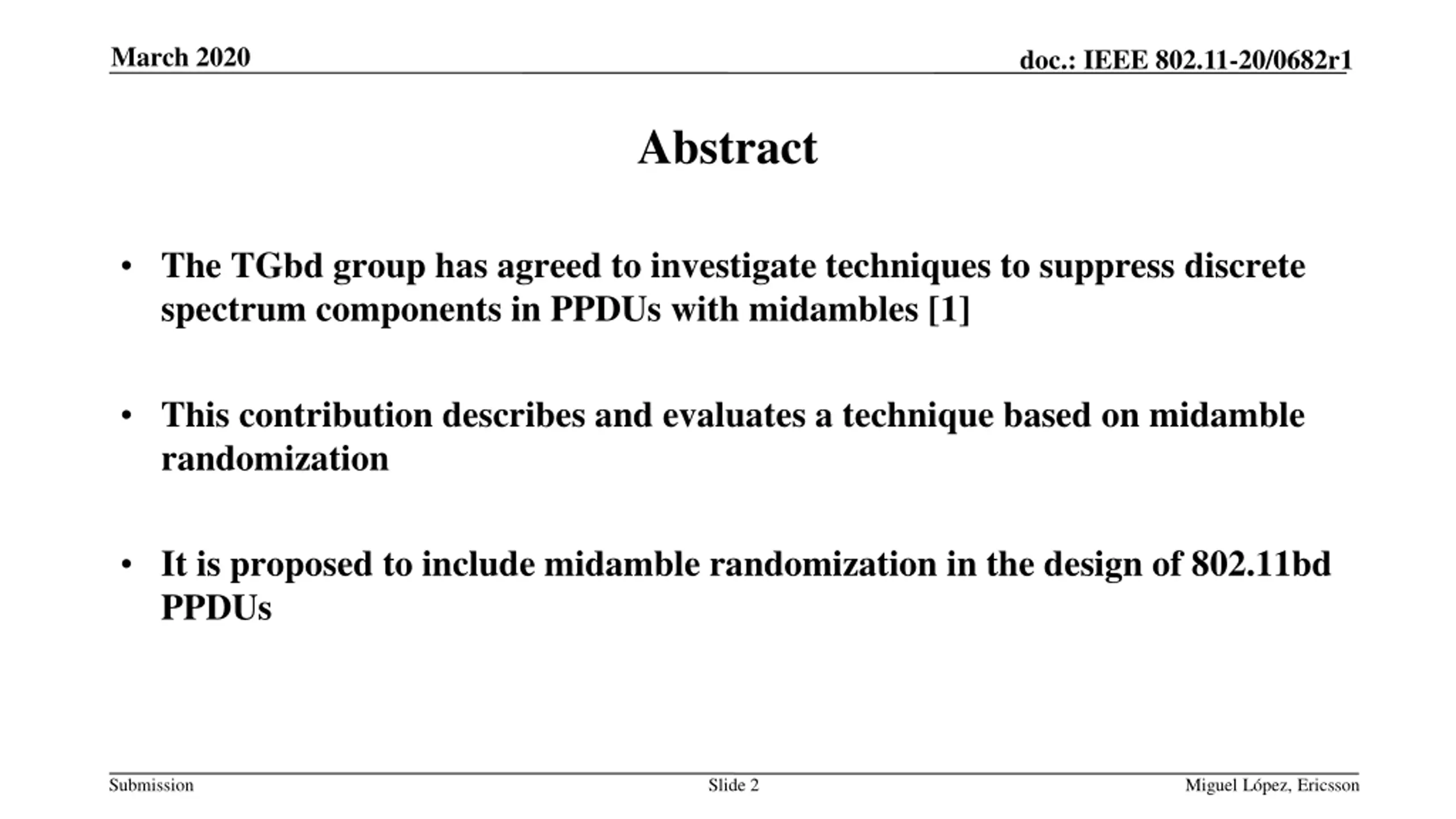 March 2020 doc.: IEEE 802.11-20/0682r1 Abstract The TGbd group has agreed to investigate techniques to suppress discrete spectrum components in PPDUs with midambles [1] This contribution describes and evaluates a technique based on midamble randomization It is proposed to include midamble randomization in the design of 802.11bd PPDUs Submission Slide 2 Miguel L pez, Ericsson