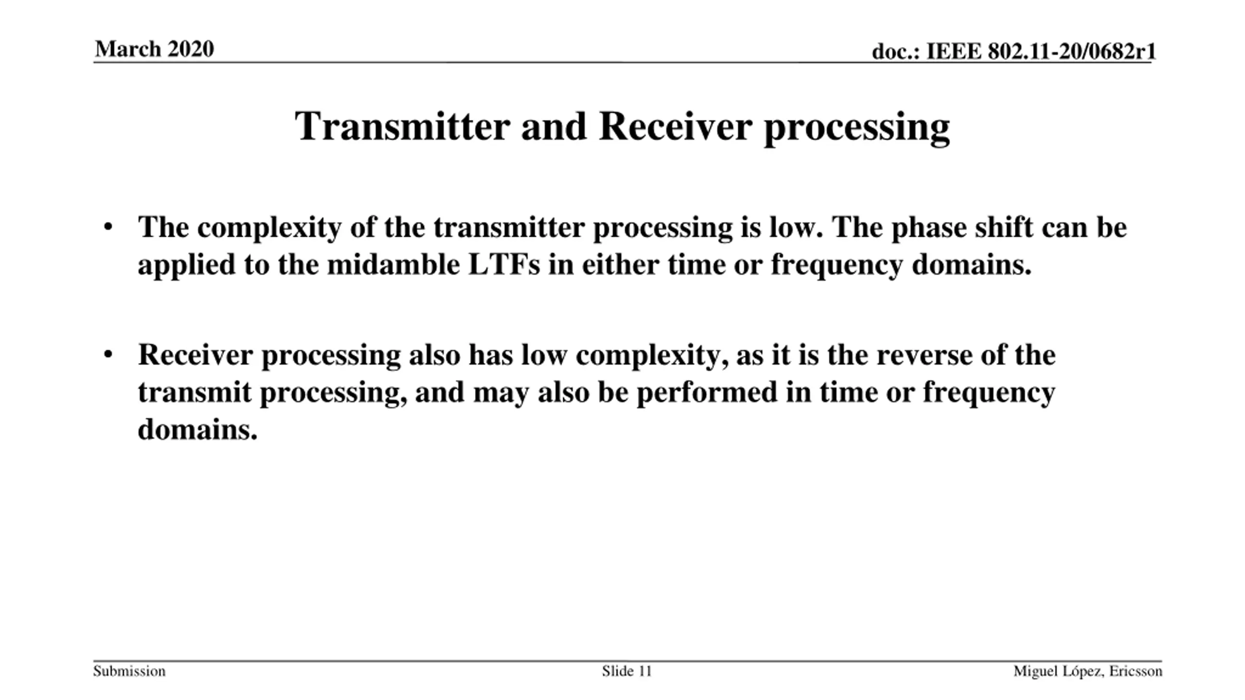 March 2020 doc.: IEEE 802.11-20/0682r1 Transmitter and Receiver processing The complexity of the transmitter processing is low. The phase shift can be applied to the midamble LTFs in either time or frequency domains. Receiver processing also has low complexity, as it is the reverse of the transmit processing, and may also be performed in time or frequency domains. Submission Slide 11 Miguel L pez, Ericsson