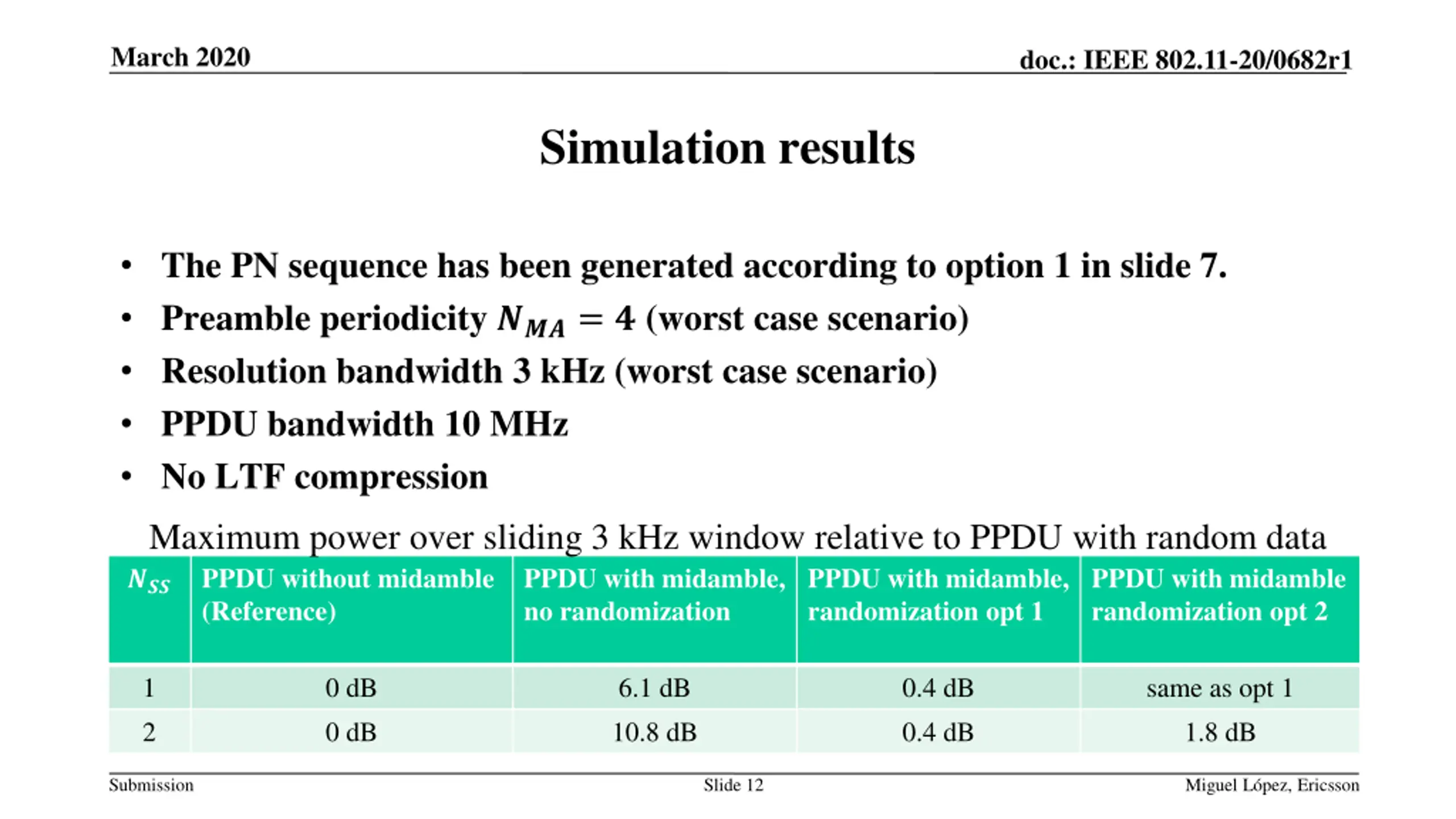 March 2020 doc.: IEEE 802.11-20/0682r1 Simulation results The PN sequence has been generated according to option 1 in slide 7. Preamble periodicity ???= ? (worst case scenario) Resolution bandwidth 3 kHz (worst case scenario) PPDU bandwidth 10 MHz No LTF compression Maximum power over sliding 3 kHz window relative to PPDU with random data PPDU without midamble (Reference) PPDU with midamble, no randomization PPDU with midamble, randomization opt 1 PPDU with midamble randomization opt 2 ??? 1 2 0 dB 0 dB 6.1 dB 10.8 dB 0.4 dB 0.4 dB same as opt 1 1.8 dB Submission Slide 12 Miguel L pez, Ericsson
